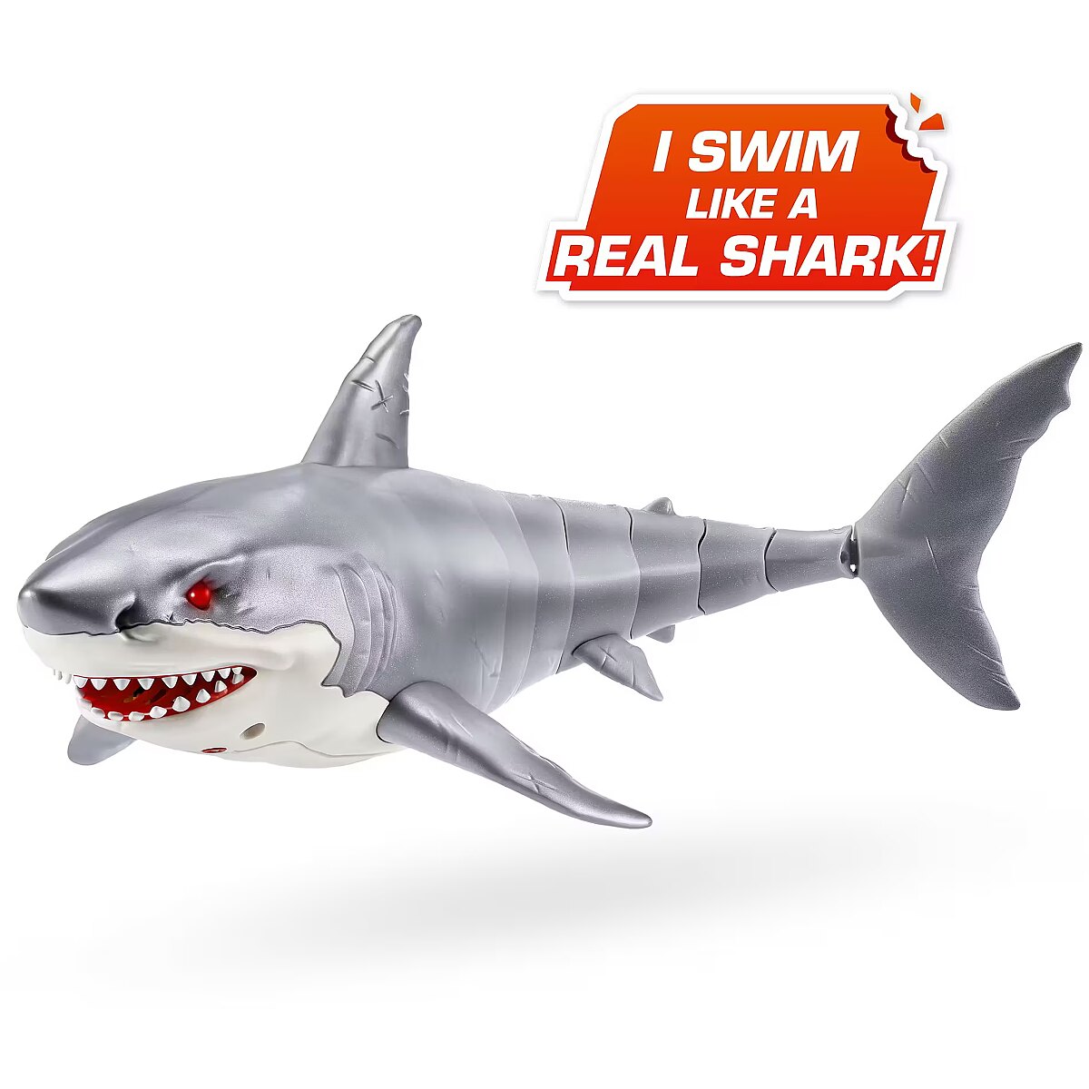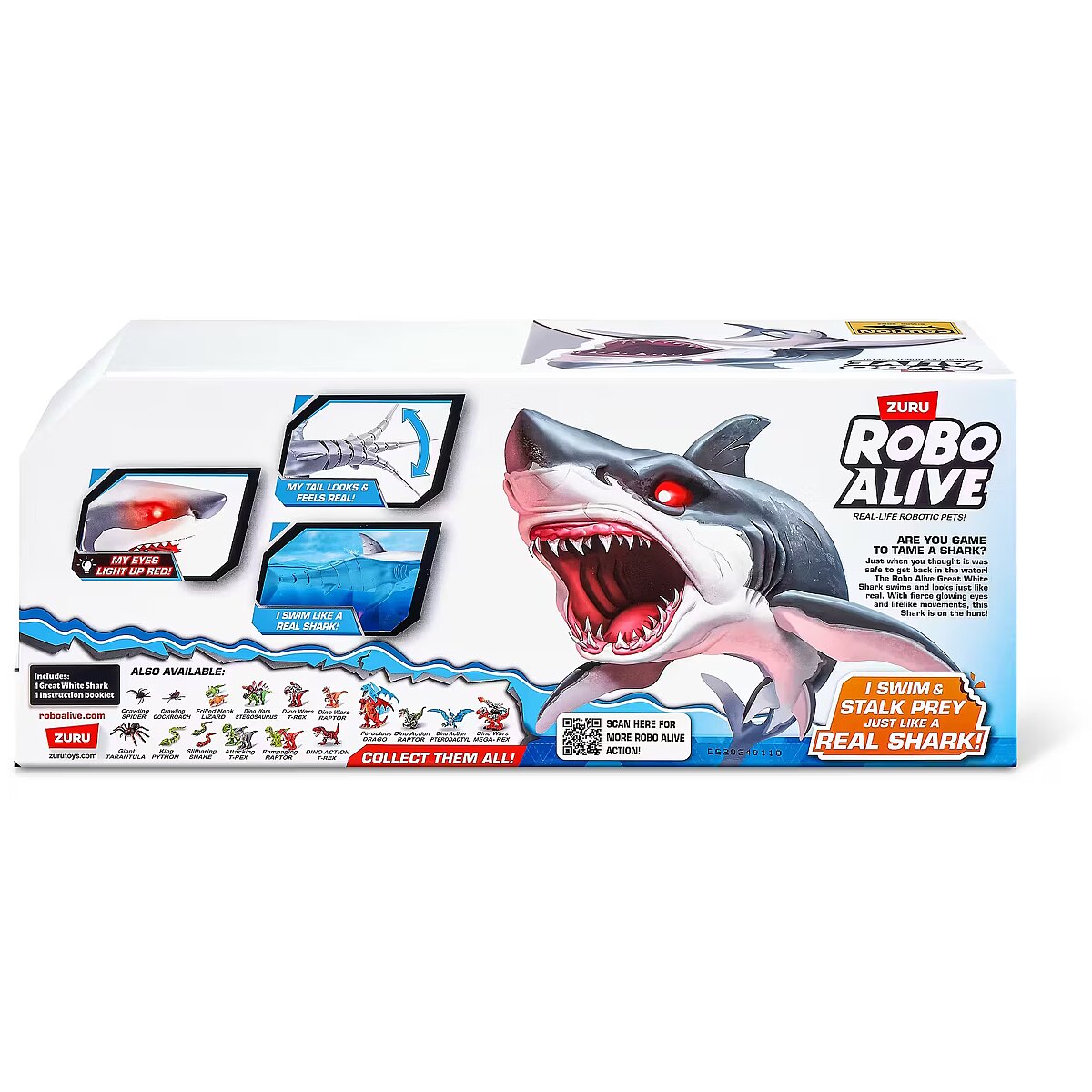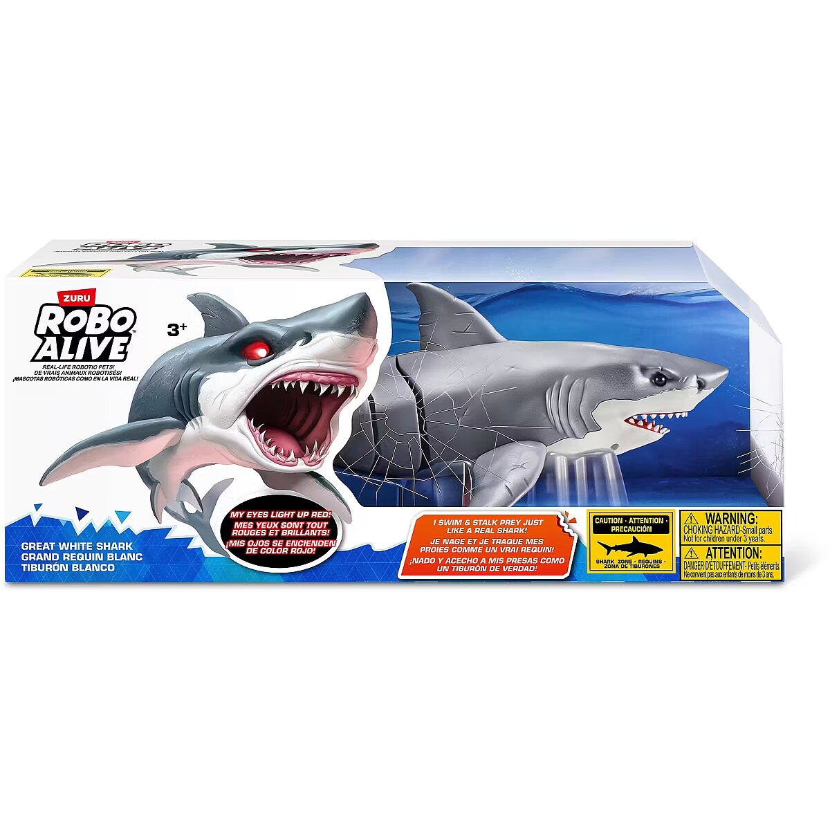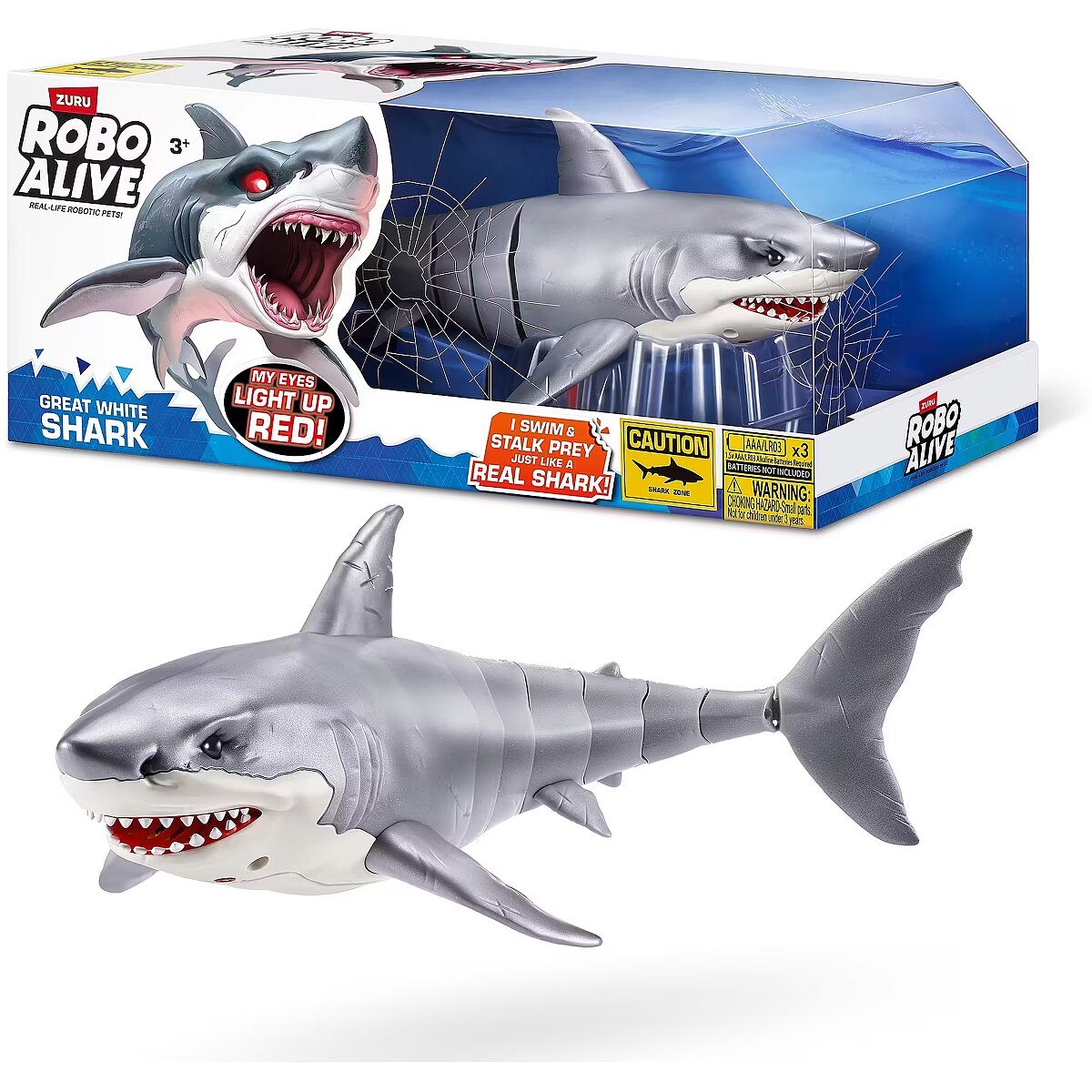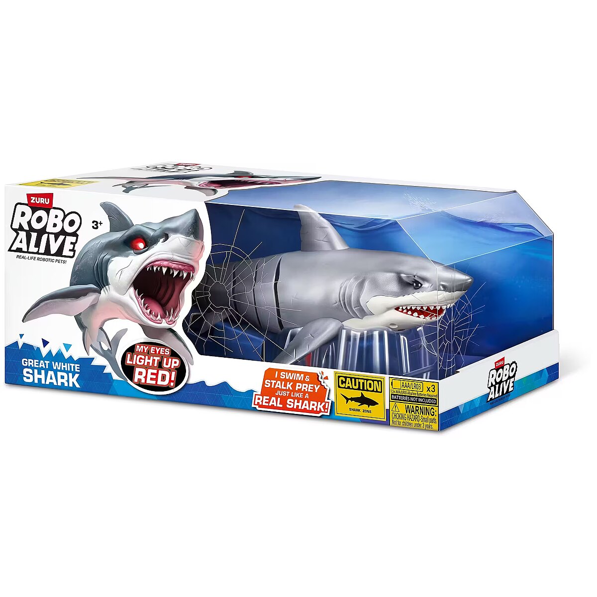 LongDesc - Robo Alive Great White Shark Series 1 ZURUAre you game to tame the Great White Shark, or will you be its next prey? The Great White Shark comes to life in water with ZURU’s advanced water activated technology, and swims just like a real-life shark. You’ll have your friends and family pranked in no time. With fierce, glowing eyes and life like movements, this shark is on the hunt!