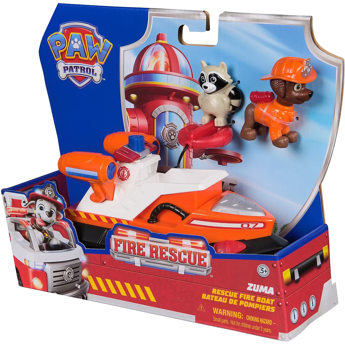 LongDesc - Set sail on thrilling rescue missions with the PAW Patrol Fire Rescue Zuma Rescue Fire Boat! This adventure-packed toy boat measures over 7 inches long and 3 inches tall, ready to embark on daring escapades. Zuma, standing over 2 inches tall in his fire rescue gear, is prepared to save the day. The Fire Boat features a launching lifesaver attached by a string, ensuring action-packed adventure. Zuma also comes with a raccoon animal figure to rescue. Kids can push a button to launch a rescue life preserver that allows the raccoon to fit perfectly on it. With genuine PAW Patrol styling, this toy looks just like in the show, inspiring kids to embark on adventures. These PAW Patrol learning toys are PAWsome for a birthday, or any holiday. For even more fun, combine with the Fire Rescue Command Center, Rapid Reload Fire Truck & six different Fire Rescue figures & vehicles, so the excitement never ends. (each sold separately) Relive cherished moments from past PAW Patrol seasons, like the Mighty Pups and PAW Patrol Movie, or create new adventures with a PAW Patrol tower, individual PAW Patrol action figures and their PAW Patrol vehicles, for turbo-charged adventures.Includes: 1 Vehicle, 2 Figures