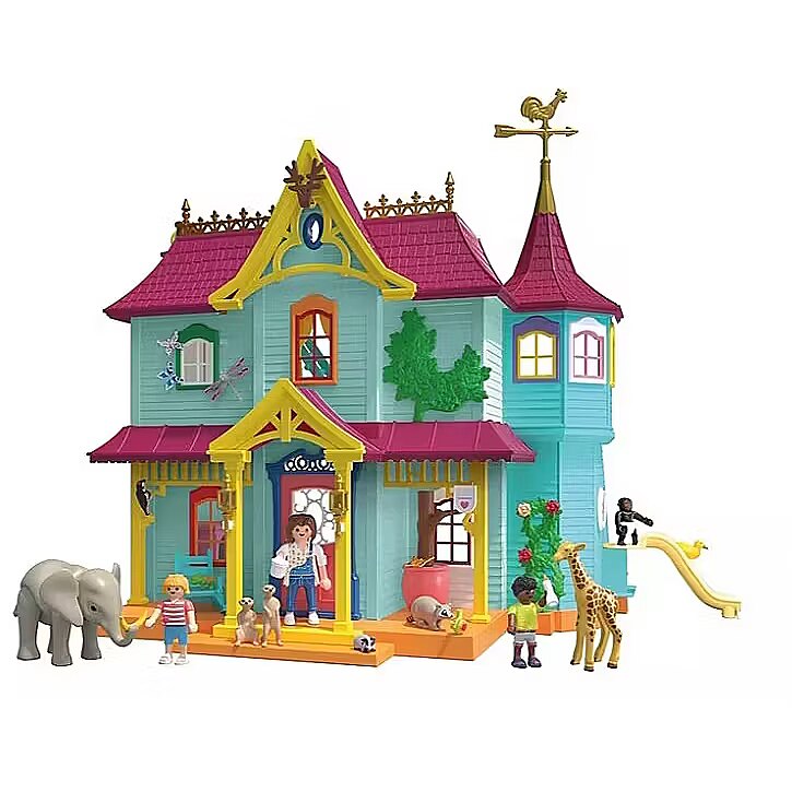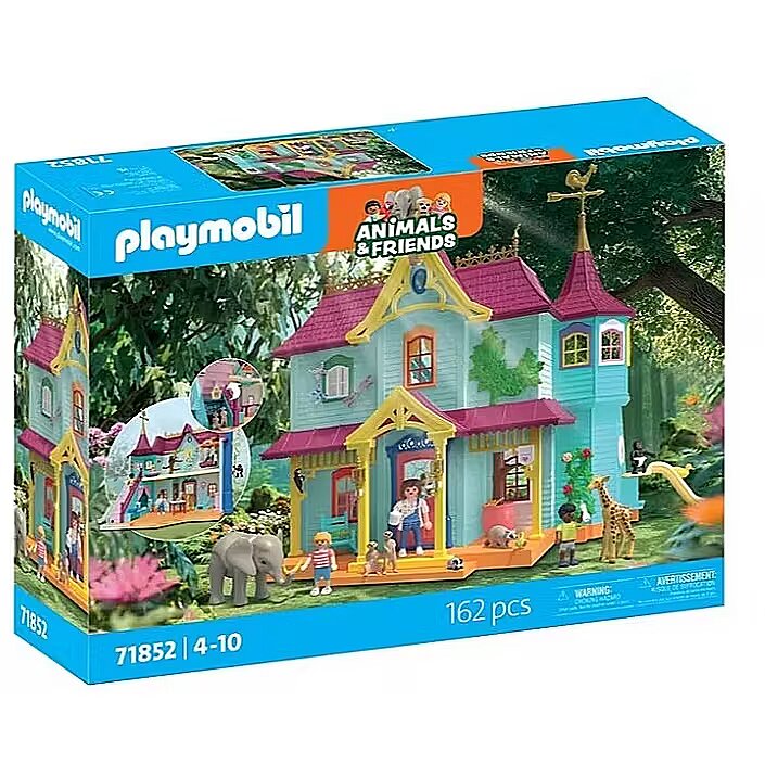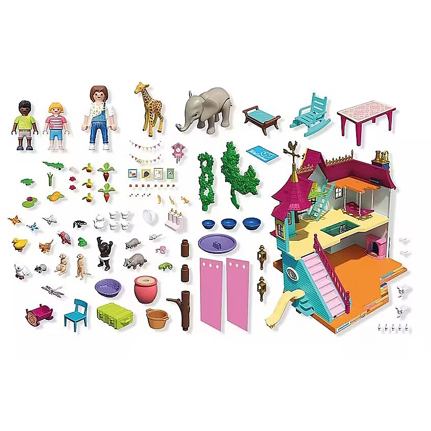 Description - Witamy w kolorowym świecie Animals & Friends - gdzie to, co wspaniałe jest częścią codziennego życia, a wyobraźnia nie zna granic. Tętniąca życiem, wesoła willa jest centralnym miejscem w życiu kochającej zwierzęta kobiety, jej dwójki dzieci i ich zwierzęcych towarzyszy. Tutaj wszyscy dobrze się bawią i zawsze mogą na siebie liczyć. Mały słonik chętnie pomaga nakrywać do stołu, a mała żyrafa podkrada wszystkie smakołyki. Szopy bawią się na strychu, małe gepardy uwielbiają się huśtać, a mała małpka lubi wspinać się i odpoczywać na drzewie, które znajduje się nieopodal ganku domu. Ale gdzie jest mała kaczka? Z radością pluska się w krytym stawie. Surykatki znalazły swoje ulubione miejsce w tajnej kryjówce pod schodami. Jednak najbardziej poszukiwanym miejscem w całym domu jest przytulna jaskinia z łóżkiem, znajdująca się pod schodami. Witamy w Zwierzęcej Rezydencji PLAYMOBIL - radosnym domu, w którym zwierzęta i ludzie żyją w idealnej harmonii! Figlarny słonik uwielbia huśtać się wysoko, a rezolutna żyrafka podkrada smakołyki ze stołu. Na strychu szopy buszują wokół skrzyni ze skarbami, a mała małpka w pieluszce wspina się na drzewo! Kaczuszka i żabka radośnie pluskają się w domowym stawie, a surykatki zerkają z tajemnego schowka w schodach. Kameleon odpoczywa przy przytulnej jaskini, a kakadu czuwa nad wszystkim z góry.