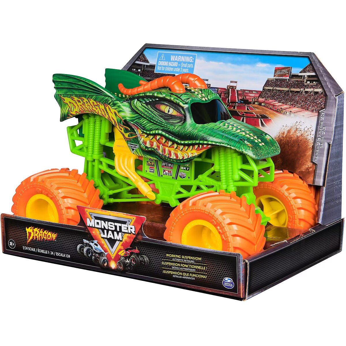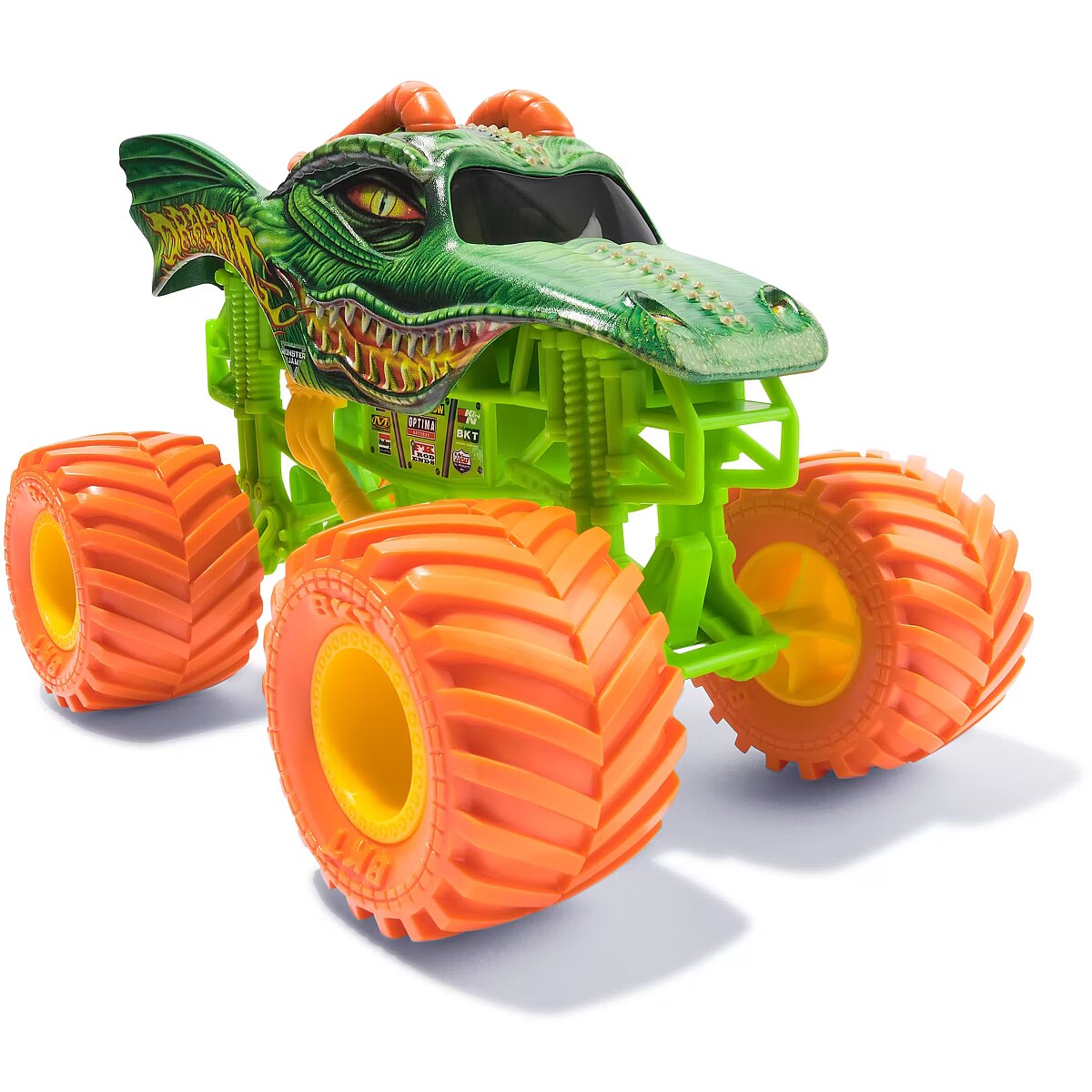 LongSummaryDescription - Monster Jam , Official Dragon Monster Truck, Collector Die-Cast Vehicle, 1:24 Scale, Kids Toys for Boys and Girls Ages 3 and up. Product type: Monster truck, Recommended age (min): 3 yr(s), Material: Metal, Plastic, Product colour: Green, Orange