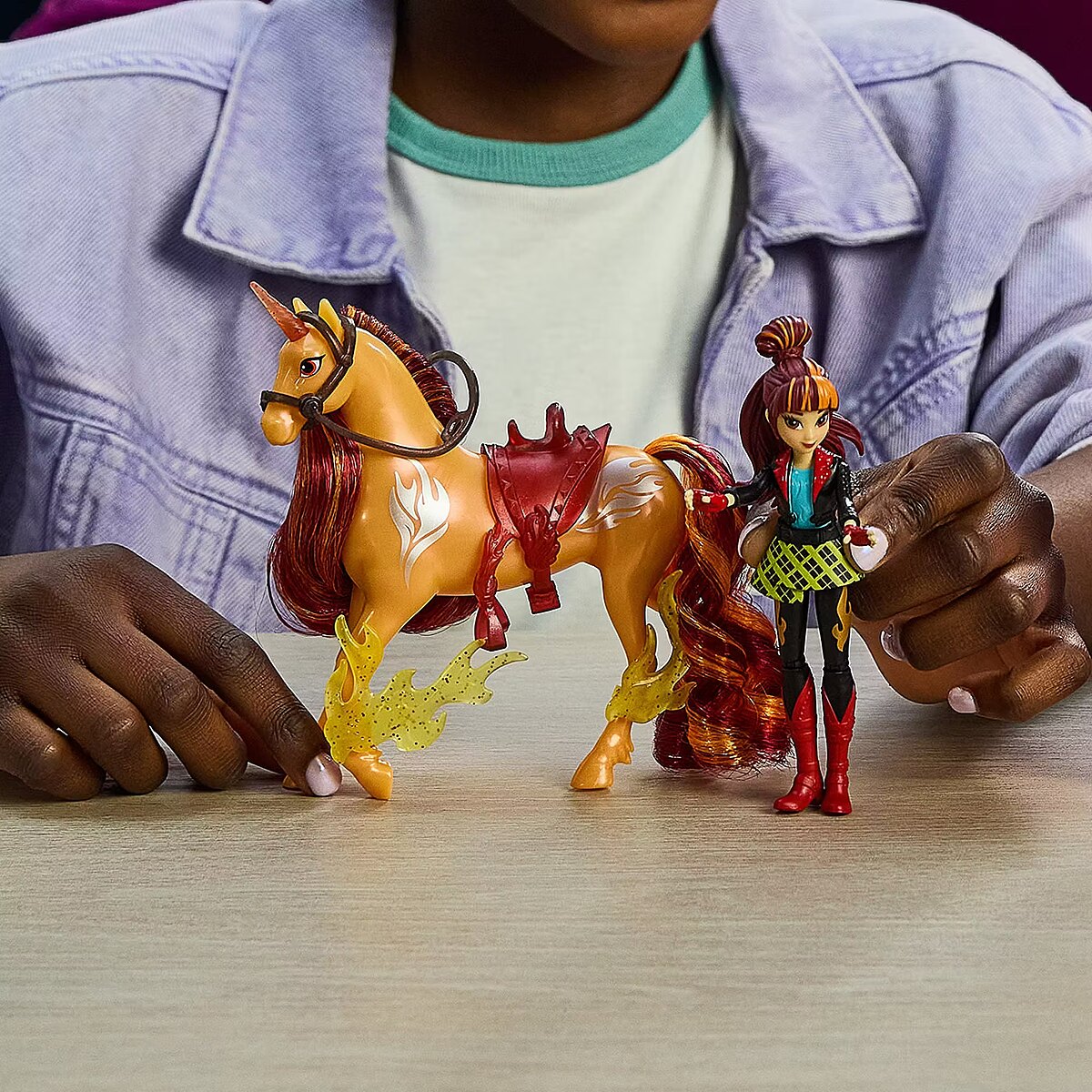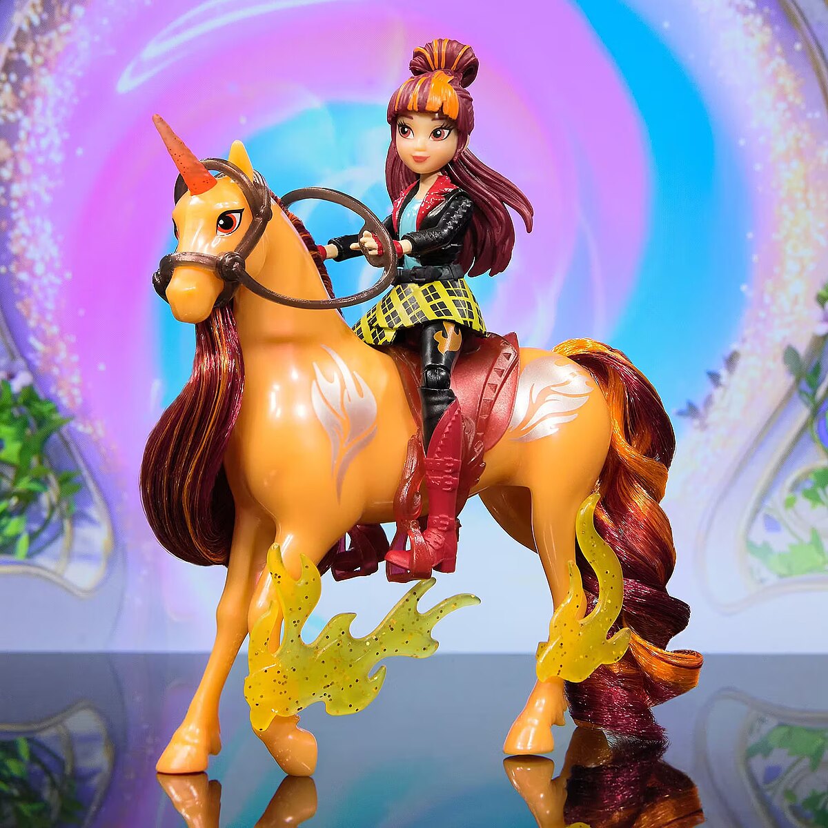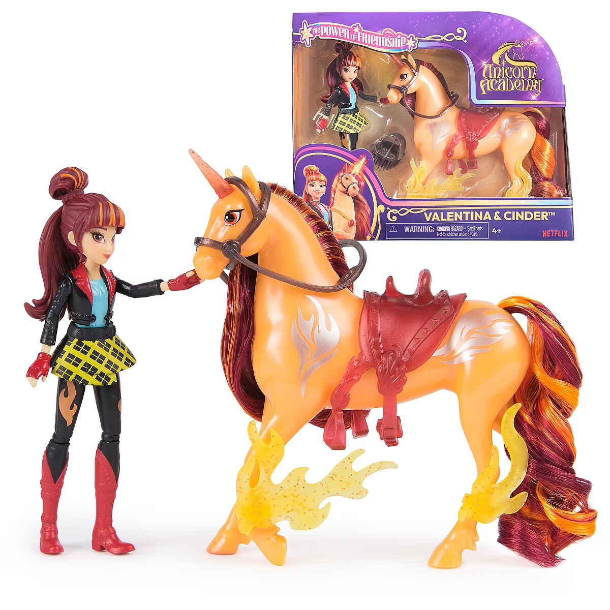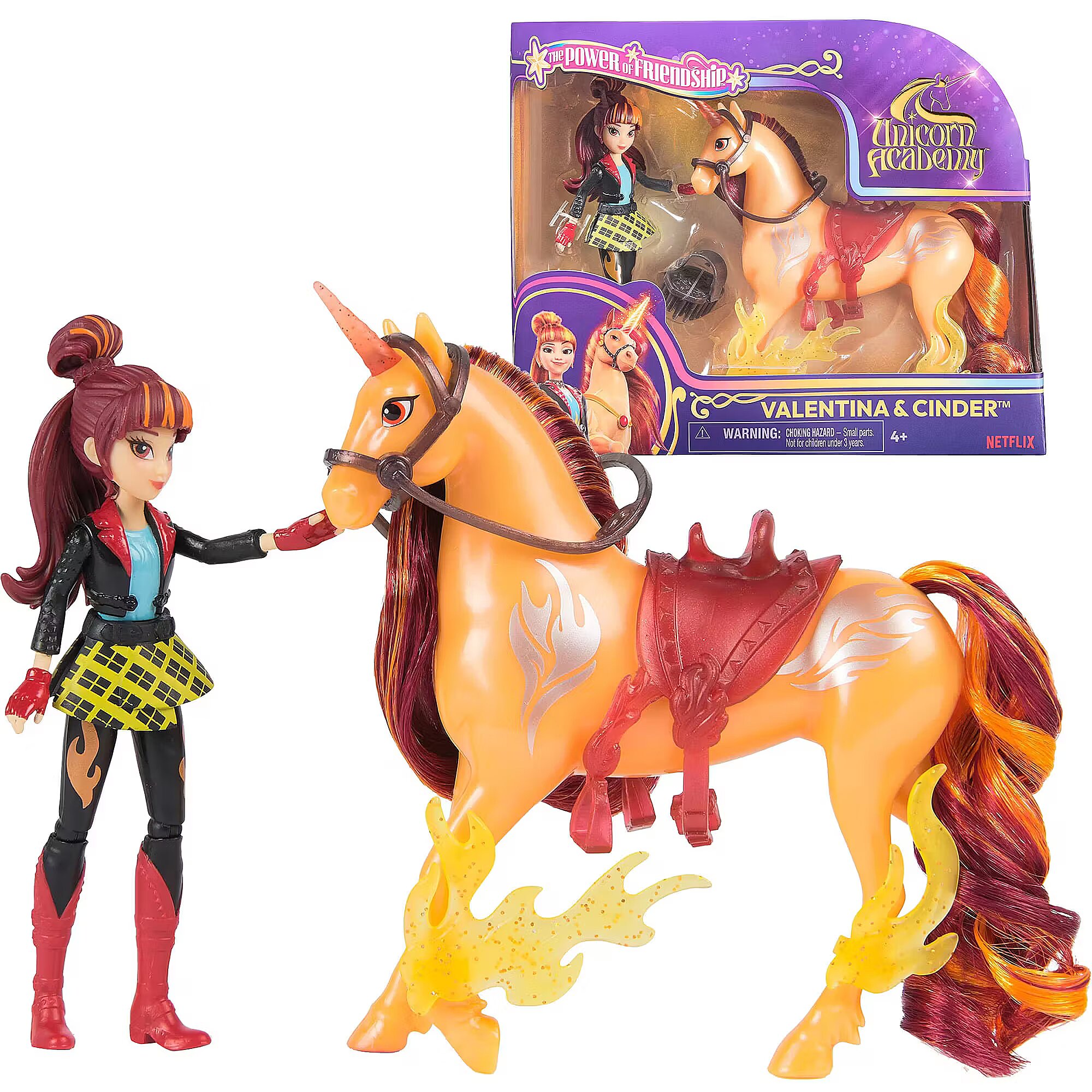 LongDesc - Celebrate the bond between rider and unicorn with the Unicorn Academy Power of Friendship-themed Valentina & Cinder Set. Inspired by the NETFLIX animated show and book series where friendship reins, this set will spark endless imaginative storytelling. 4.5-inch Valentina features realistic true-to-show details including metallic power markings, and 7 points of articulation for dynamic poses. Cinder stands at 5 inches tall, complimenting Valentina’s look with beautiful details, including metallic Fire Magic markings and 2 translucent clip-on power accessories for his legs. Keep Cinder’s mane shiny and smooth with the brush, and as you play, pose Valentina on Cinder and ride into adventure. With the translucent removable bridle and saddle accessories, Valentina can securely stay in place on Cinder. For more ways to experience Unicorn Academy with your favorite characters, look for the other dolls, including Sophia, Ava, Layla, Isabel, and their unicorns (sets sold separately) and expand your world. For kids who enjoy unicorns and horse toys, dolls & accessories, doll house play, collectibles, plush toys and more, Unicorn Academy toys are fun birthday gifts for girls or gifts for any occasion. Experience enchanting Unicorn Academy adventures with the Valentina & Cinder Set.Includes: 1 Doll, 1 Unicorn, 1 Removable Saddle, 1 Removable Bridle, 2 Power Accessories, 1 Hair Styling Tool
