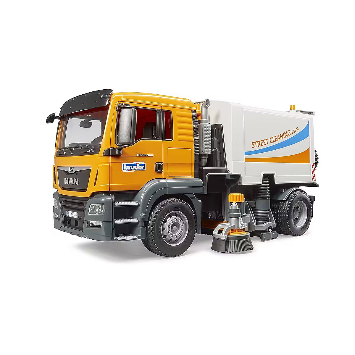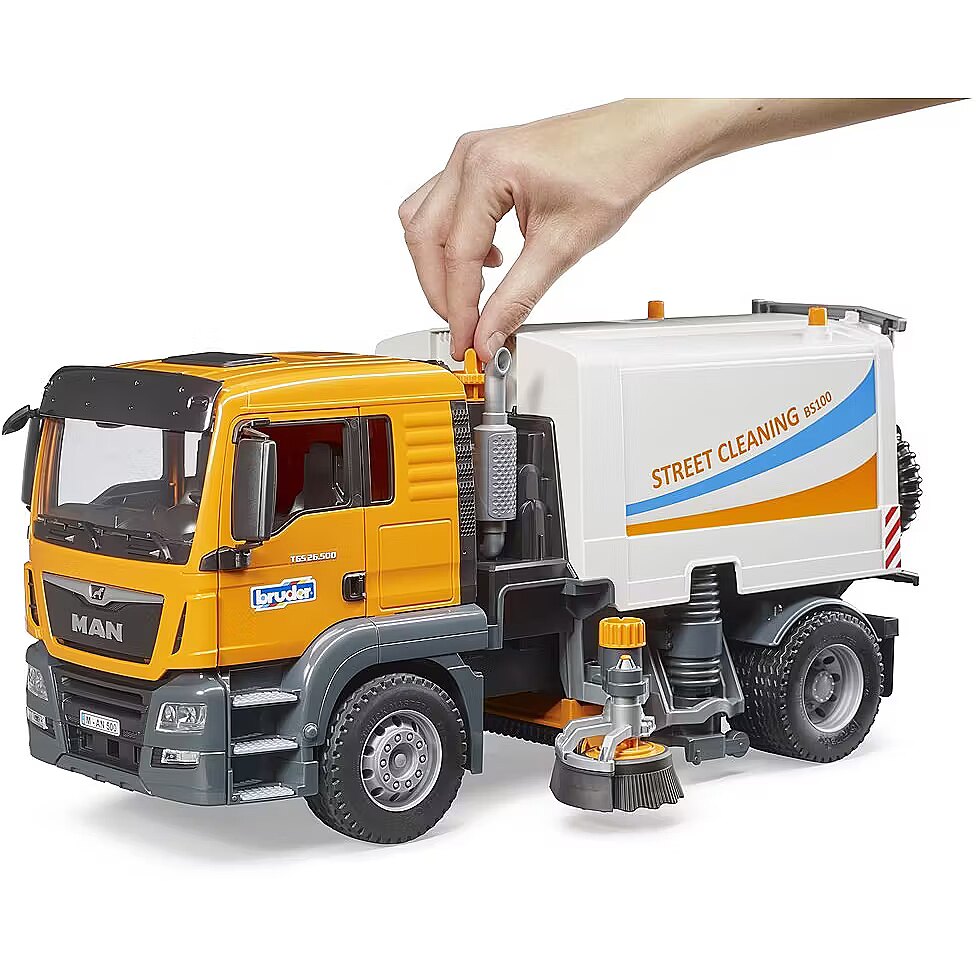 Description - Bruder 03780 MAN TGS road sweeper An excellent educational toy whose main features are: Glazed cab - unbreakable plastic Folding mirrors Opening doors Movable bonnet Soft rubber tyres with tread Side brushes rotatable by rotary knob, vertically movable Rotating lower brush Lifting waste container with tailgate Movable suction tube Light and sound module can be fitted (02801 or 02802) Compatible with Bruder figures Features typical Bruder toy qualities: Superior build quality Perfect reproduction Functionality.