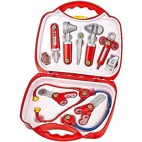 Apraksts - KL 4383 Medicīniskais komplekts vidēja izmēra koferī Komplektā koferī ir katra mediķa pamataprīkojums. Sarkanais koferis ir izgatavots no ļoti izturīgas plastmasas, tam ir ērts rokturis un dzeltena skava, kas pasargā to no atvēršanas. Šajā mazajā komplektā ir 13 elementi. Visi tie, protams, ir droši bērniem un viegli lietojami. Koferī ir sarkans un tumši zils plastmasas stetoskops, plastmasas šķēres, knaibles, šļirce, termometrs, otoskops, āmurs, kaste vates tamponiem, ģipsis, pincete un piezīmju grāmatiņa. Visi elementi, protams, ir droši bērniem un viegli lietojami. Medicīnas komplektu un piederumu sērija, no vienas puses, tiek izmantota, lai spēlētu ārstu vai medmāsu, un, no otras puses, palīdz bērniem pierast pie ārsta apmeklējuma, veikto testu un procedūru tēmas. Šeit ir plašs komplektu klāsts ar vairāk vai mazāk piederumiem, kā arī vairāki atsevišķi produkti, piemēram, medicīniskie priekšauti vai stetoskopi. Visa sērija ir vizuāli veidota tā, lai ar to varētu spēlēties gan zēni, gan meitenes.