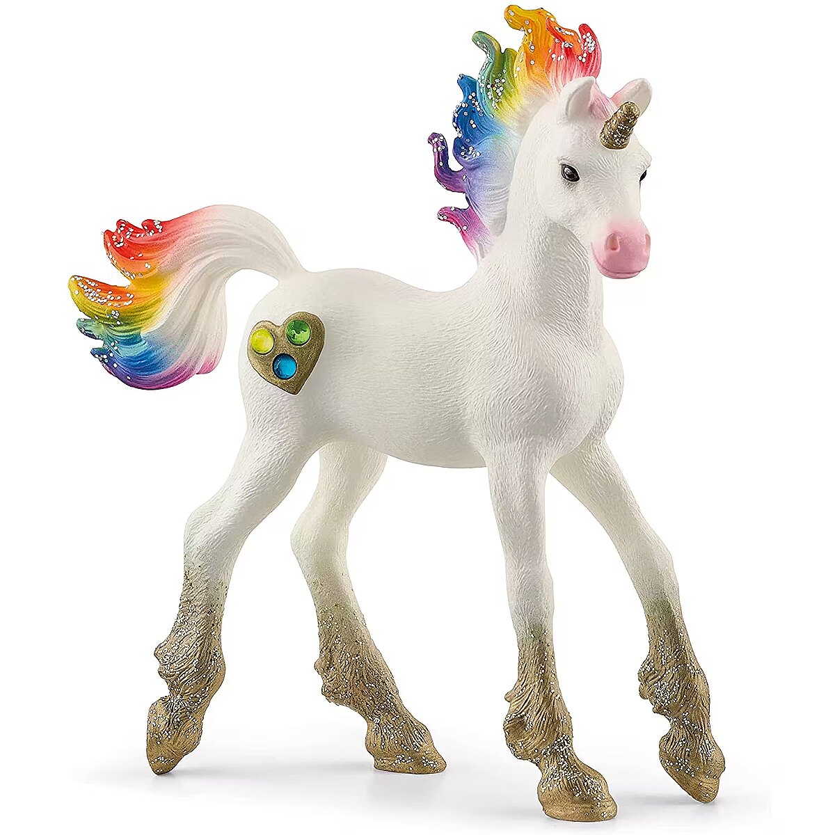 LongDesc - Twinkle and shine, sparkle and gleam – the Rainbow Love Unicorn Foal is glimmering with magic and enchantment! This adorable rainbow unicorn has a mane and tail streaked with radiant color. A metallic golden horn dazzles with brilliance in the morning sun. Each of the unicorn's legs is shimmering in glittery gold. Makes a perfect gift for unicorn lovers ages 5 and up.Imagine you’re on a midnight hike to a magical waterfall. A gentle mist twinkles in the air as you hug the river bend. Moonlight twinkles in the tiny water droplets, bathing the night sky in rainbow hues. You’ve never seen a moonlight rainbow before! Are your eyes playing tricks on you, or did you just glimpse a glittering unicorn splashing in the rainbows? With the Rainbow Love Unicorn toys from Schleich, the story possibilities are endless. What magical stories will you and your rainbow unicorns tell next?