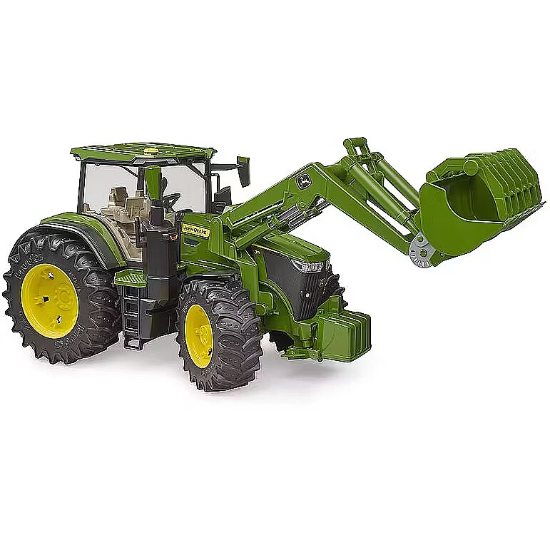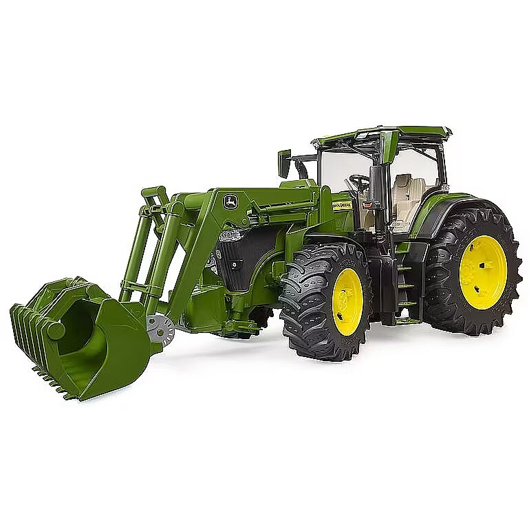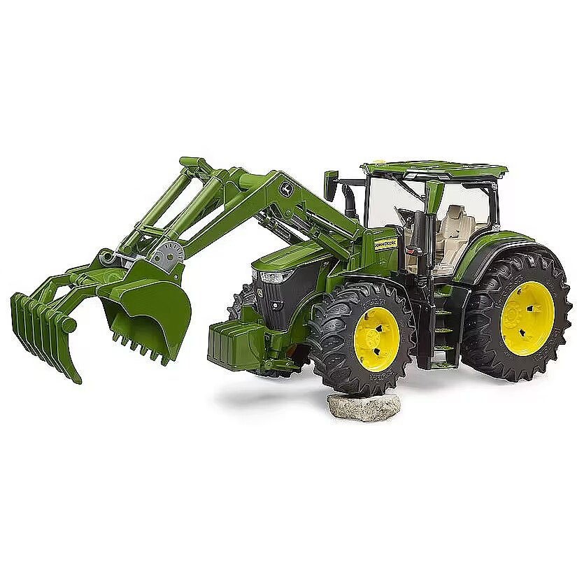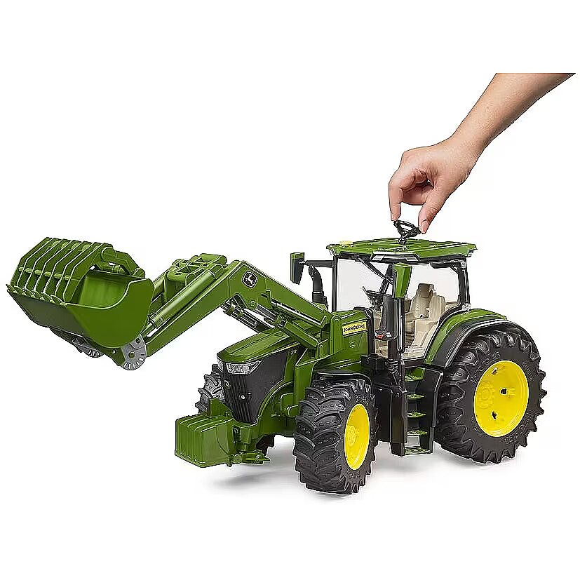 Description - John Deere 7R 350 tractor with loader An excellent educational toy whose main features are: Extended steering wheel for easy manoeuvring Soft rubber tyres with tread Opening bonnet Opening cab doors Off-road suspension system Standard front and rear hitch Removable counterweight Functional front loader Compatible with bWorld figures and many Profi series agricultural machines and trailers Features typical Bruder toy qualities: Superior build quality Perfect reproduction Functionality