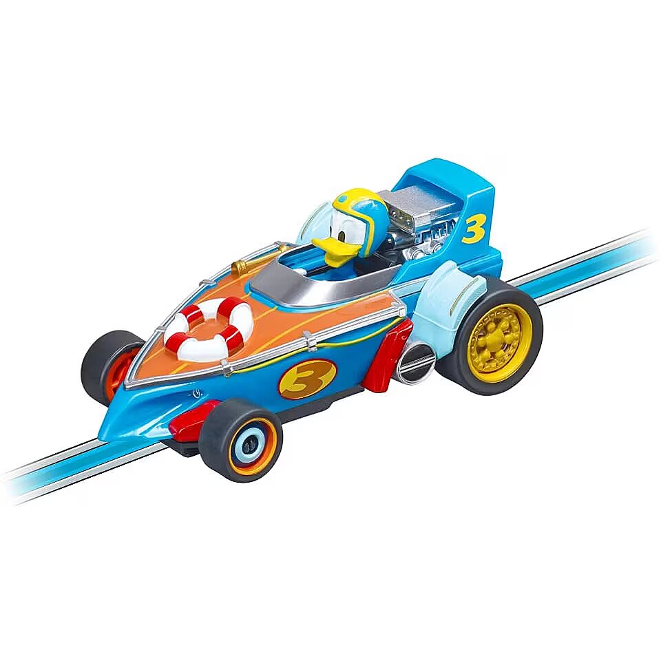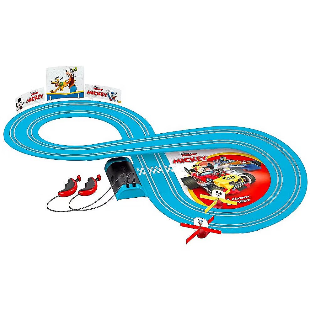 Description - Fun and games with Mickey Mouse and Donald Duck Welcome the two pals, Mickey and Donald, to your bedroom motordrome! The Carrera FIRST 'Mickey Fun Race' set sees these two kids' favourites fly around your blue 2.4-meter racing circuit. Thanks to the original reproduction licence, the brightly-coloured track and faithfully-detailed toy cars are always a thrilling sight! There are lots of eye-catching Mickey Mouse decor elements like the exciting roundabout loop with this bedroom track. The simple battery-powered slot-together Carrera FIRST set is ideal for on-the-road action.