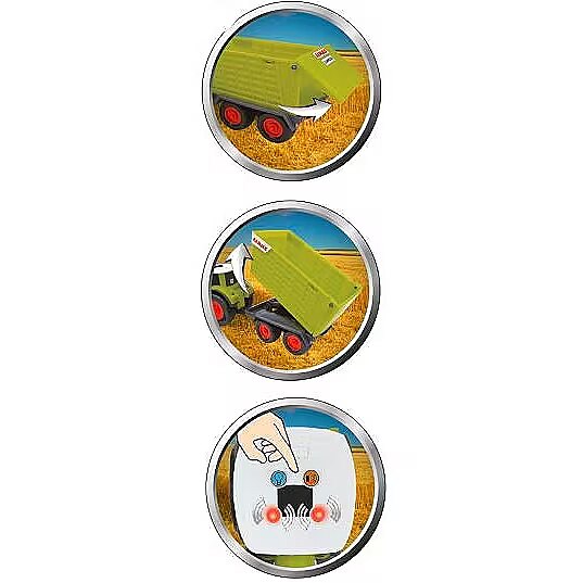 Description - HP 34541 Claas Mini tractor + trailer Cargos The Tractor Class Kids set includes a tractor vehicle and a trailer. The tractor and trailer are in green with wheels in black with red accessories. When the corresponding button on the cab is pressed, the tractor makes an engine sound and the warning lights come on. The Cargos trailer has an opening tailgate and the whole set is approximately 28 cm long. With their sweet eyes, the CLAAS Mini vehicles enchant the little ones and bring a smile to their faces. The toy is child-friendly thanks to its rounded corners and edges and fits perfectly into the hands of young children. Batteries are included in the package (batteries are a replaceable item 2 X 1.5V R44) Toy suitable for children from 12 months.