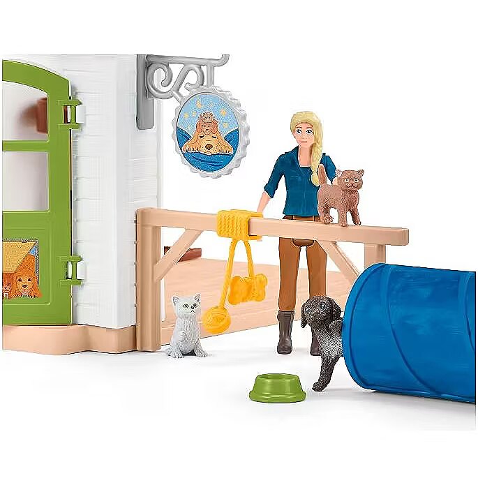 LongDesc - All your animal friends will find a home in the schleich® Pet Hotel! Your schleich puppies can romp on the doggy obstacle course, the cats love their scratching post, and even the guinea pig is crazy its little seesaw. Check-in at the schleich® Pet Hotel is now open...stay as long as you like!This animal hotel leaves nothing to be desired! The nice keeper takes care of her animal guests and always has enough space for everyone. The hamster, rabbit and guinea pig play hide and seek in their little dens. But a crunchy lettuce leaf quickly lures them out. Meanwhile, the kittens are climbing all over the scratch post. The two puppies prefer to have their adventures outside. They balance along the seesaw, slide down the slide and run through the tunnel. The little billy goat watches all this with curiosity, and every now and then baas in disapproval.