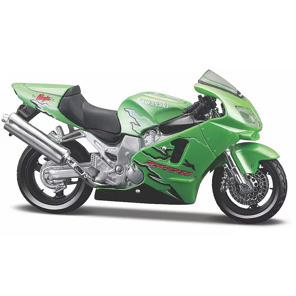 Description - Metal model Kawasaki Ninja ZR-12R 1/18 motorcycle with a stand The 1:18 scale model is characterized by great attention to detail and a movable suspension. It is a faithful reproduction in scale of a real motorcycle. The set includes a display stand with the name of the motorcycle. The model can also stand without a stand (it has a retractable leg).