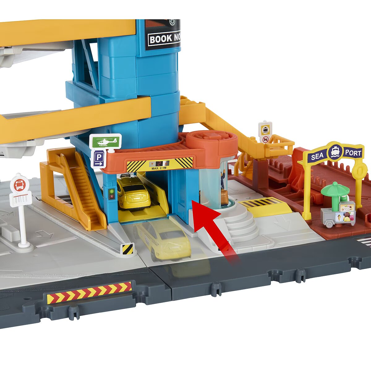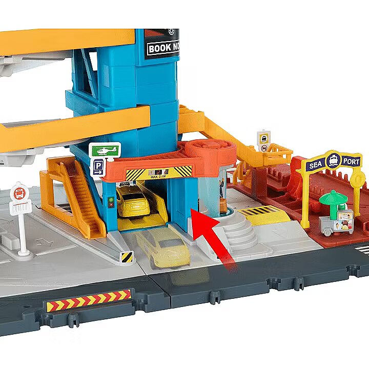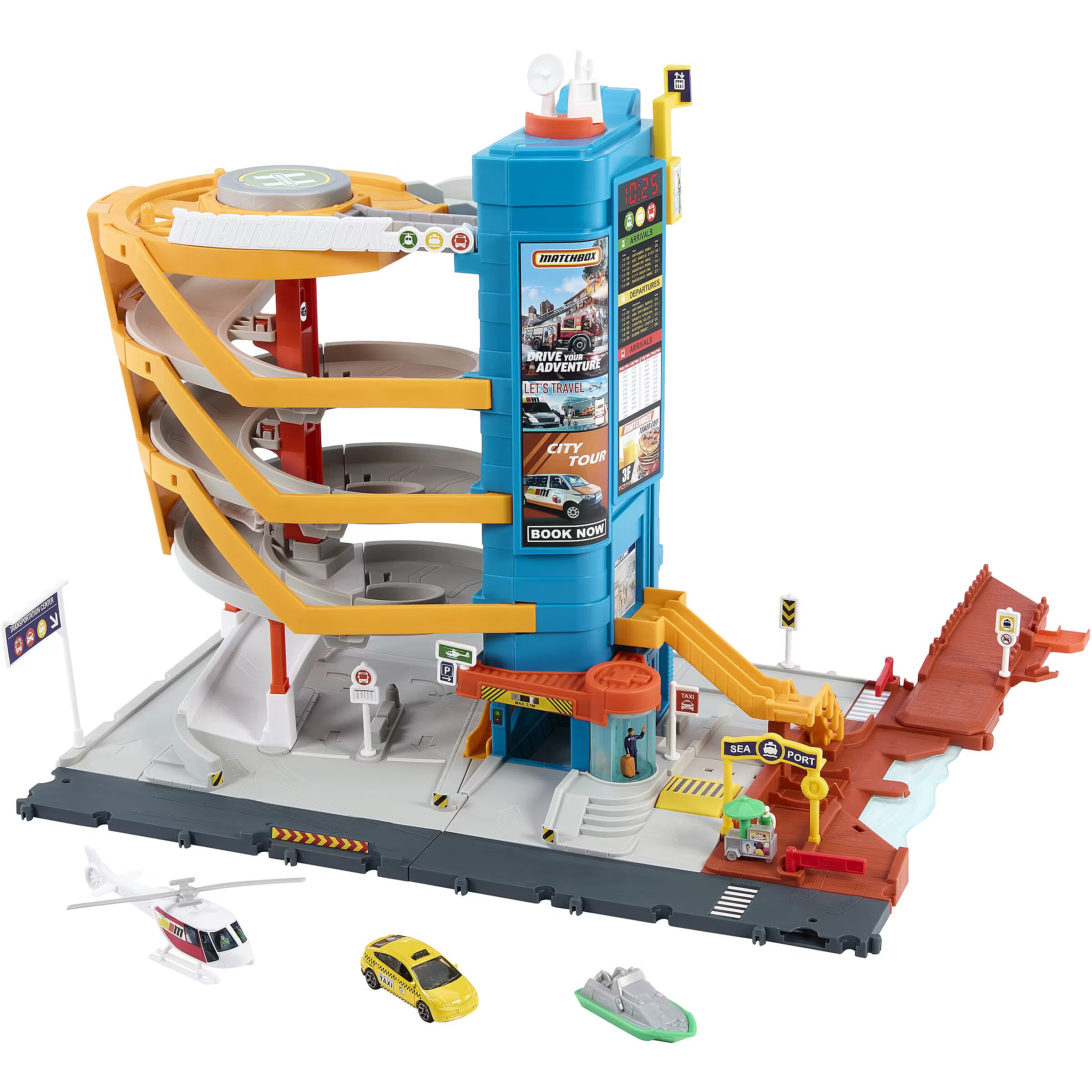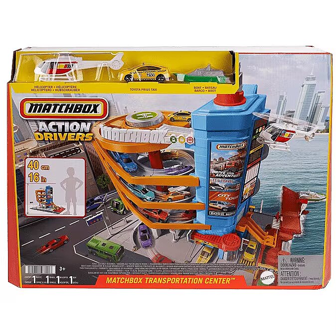 LongDesc - Dodieties aizraujošos piedzīvojumos uz zemes, gaisā vai jūrā ar Matchbox Action Drivers transporta centru. Šajā iespaidīgajā rotaļu komplektā ir piecu līmeņu autostāvvieta, laivu piestātne un helikoptera laukums, un tajā ietilpst 1:64 mēroga taksometrs, laiva un helikopters, kas nodrošina reālistisku stāstu izstāstīšanu. Brauciet līdz pasažieru iekraušanas zonai, lai aktivizētu rotējošās durvis un atklātu ierodošos pasažierus. Pārliecinieties, ka ir pārtikas pārdevējs, ja viņi ir apstājušies, lai uzēstu uzkodas. Ar bērnu darbināmo liftu uzbrauciet uz autostāvvietas struktūru, kurā var novietot 12 atliektus transportlīdzekļus, un, kad helikopters nolaižas uz helikopteru platformas, tas nosūta transportlīdzekļus virpuļot garāžā un izbraukt no tās uz satiksmi. Jūras ostā tilts izvēršas, lai izveidotu piestātni, tādējādi paplašinot komplektu un sniedzot plašākas stāstu stāstīšanas iespējas. Krāsas un dekorācijas var atšķirties,
