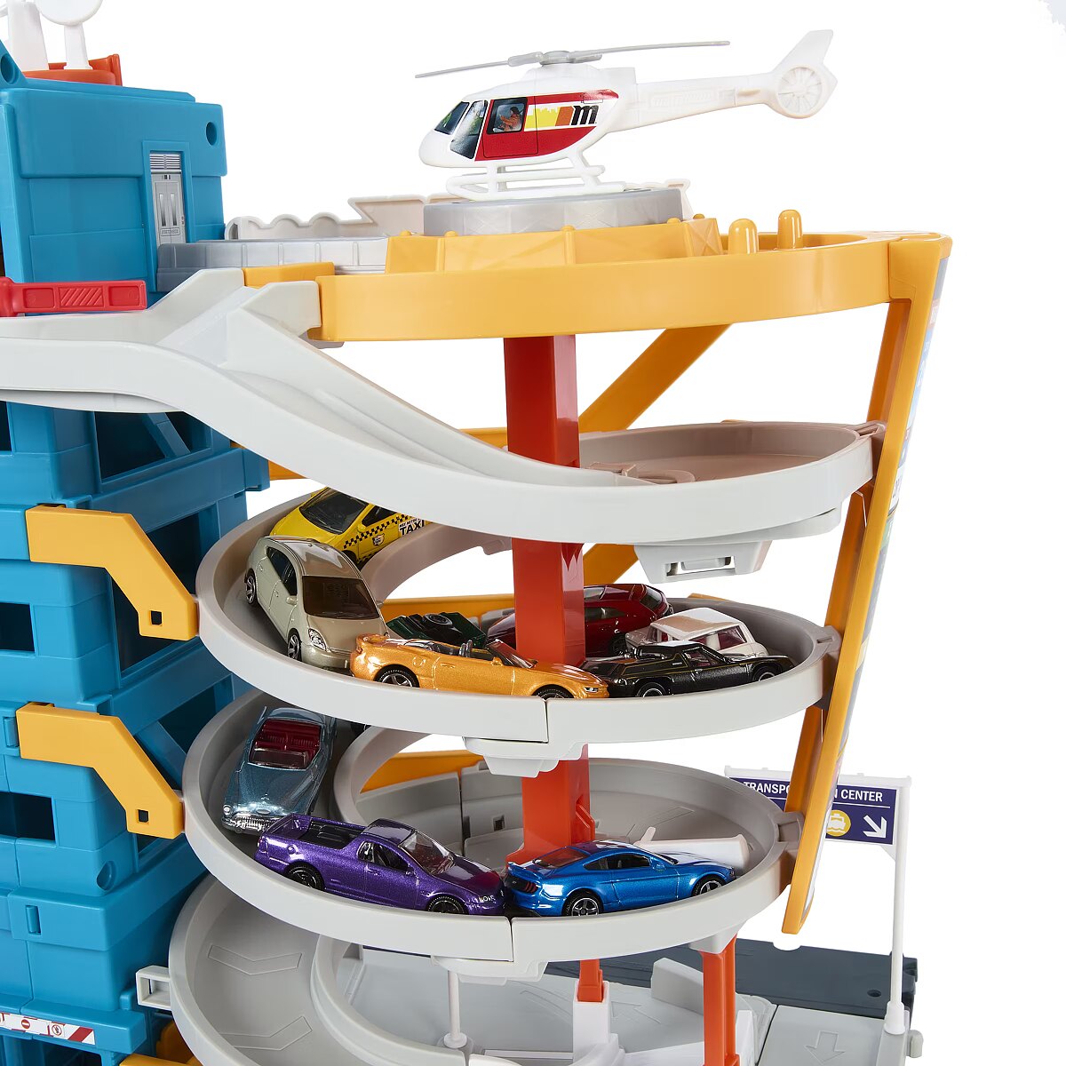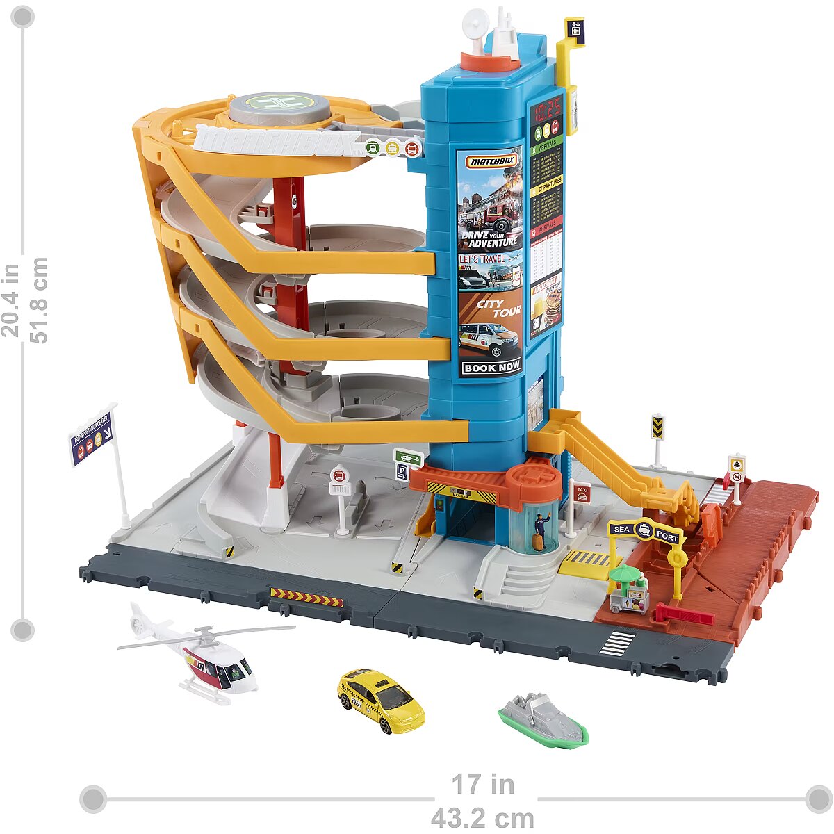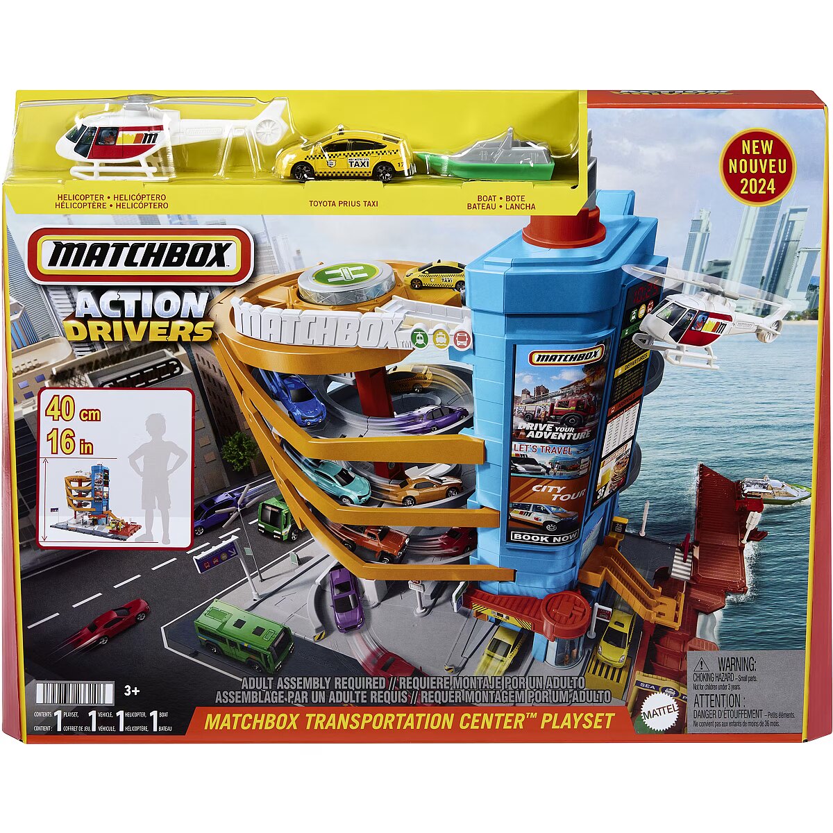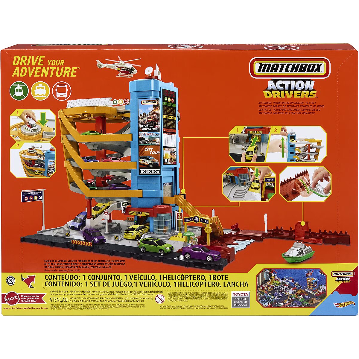 LongDesc - Take off for exciting adventures on land, in the air or at sea with the Matchbox Action Drivers Transportation Center. This epic playset features a five-level parking garage, boat dock and helipad and includes a 1:64 scale taxi, boat and helicopter for realistic storytelling. Drive up to the passenger loading zone to activate the revolving door and reveal arriving passengers. Be sure to check the food vendor in case they stopped for a snack. Take the kid-powered lift into the parking structure that can store 12 die-cast vehicles and, when the helicopter lands on the helipad, it sends the vehicles swirling down the garage and out into traffic. In the seaport, the bridge pivots out to create a pier, expanding the set for more storytelling opportunities. Colours and decorations may vary,