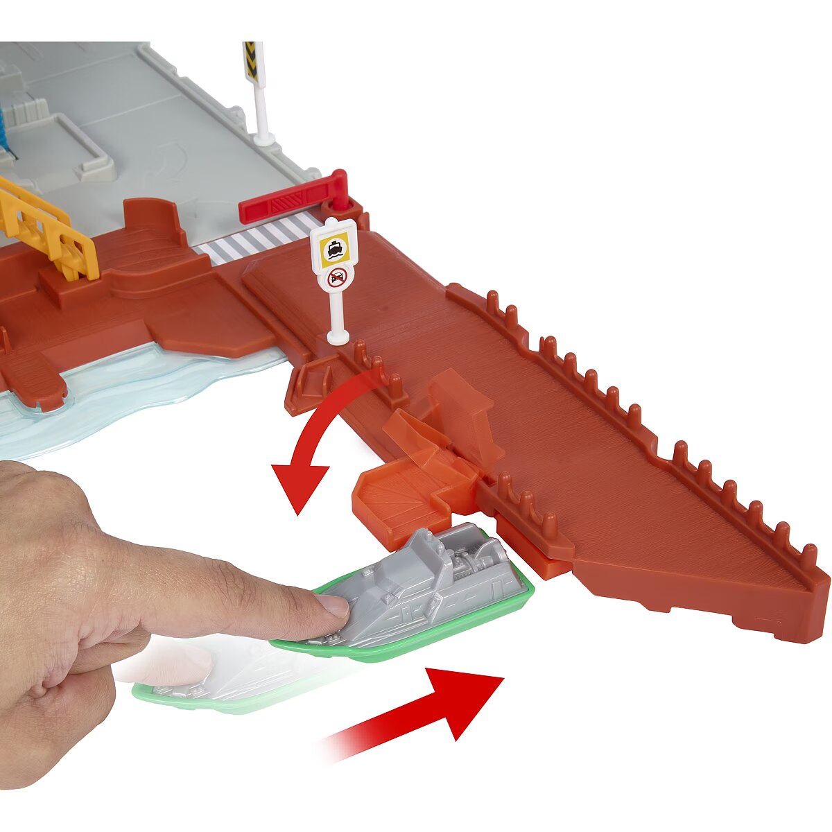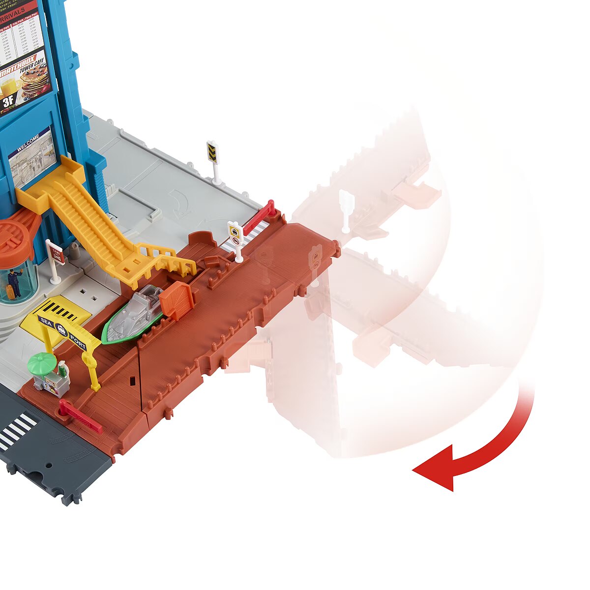 Description - Matchbox Action Drivers Prawdziwe Przygody Centrum Transportowe Popędź ku ekscytującym przygodom na lądzie, morzu i w powietrzu z tym zestawem Centrum transportowe Matchbox. Ten epicki zestaw do zabawy ma 5-poziomowy parking, dok dla łodzi i lądowisko dla helikopterów, a do tego aż trzy dołączone pojazdy: taksówkę, łódź i helikopter (wszystkie w skali 1:64) zwiększające realizm zabawy. Podjedź taksówką do strefy dla pasażerów, aby aktywować drzwi obrotowe i odsłonić przybywającego podróżnego. Zajrzyj też na stoisko z "jedzeniem". Ręcznie aktywowana winda pozwala wjechać na parking z miejscem na 12 pojazdów. A gdy helikopter osiądzie na lądowisku, pojazdy zjadą w dół i włączą się do ruchu! W porcie mostek przekręca się, tworząc pomost, co rozszerza zestaw, by zapewniał jeszcze więcej możliwości zabawy. Kolory i elementy dekoracyjne mogą się różnić.