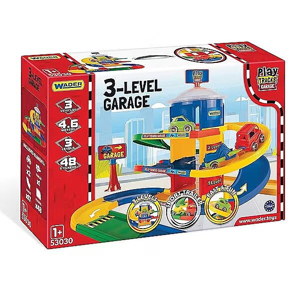Description - The 3-level car park from the Play Tracks Garage series is a fantastic toy for the youngest car enthusiasts. The modern, lightweight and easy-to-assemble construction allows the routes to be arranged in different shapes and will provide your child with lots of fun and hours of great play. The multi-coloured elements create a storied road system with a total length of 4.6 m and a three-storey garage. The set includes a Kid Cars Sport car and a Kid Cars Sport with a trailer that carries an extra vehicle, decorations and a set of stickers. The set allows the creation of many play scenarios, stimulates the imagination of our kids and inspires creative thinking. Playing with the Play Tracks Garage set supports the motor development of the youngest children, especially their small motor skills, their manual skills, precision of movements and eye-hand coordination, teaches logical thinking and spatial orientation. The variously coloured elements allow them to learn and consolidate the names of the basic colours. While playing, our child learns the rules of road traffic and how to cross the road safely. All elements are made of high-quality, child-safe and durable plastic, thanks to which all parts of the route maintain their shape and colour for many years. The set is packaged in an aesthetic box, ideal for a gift.