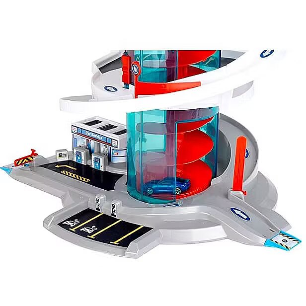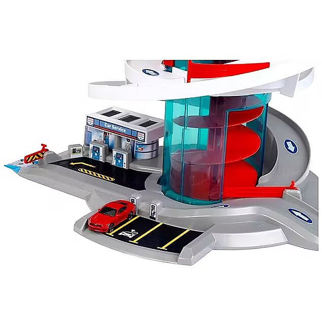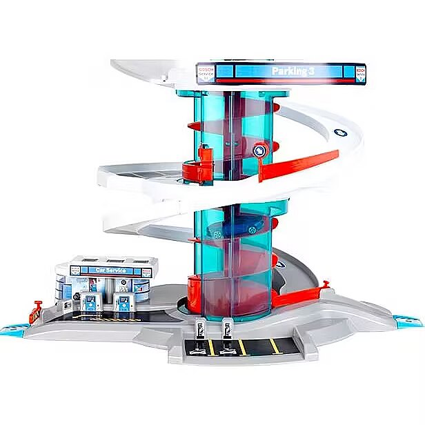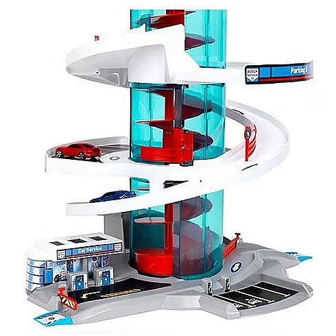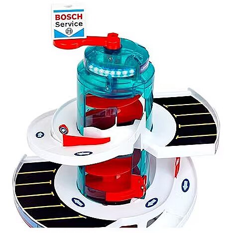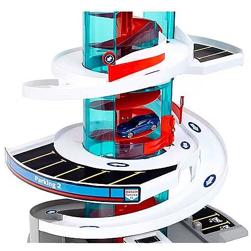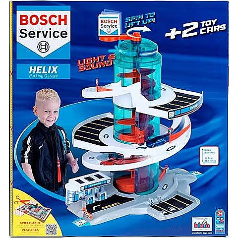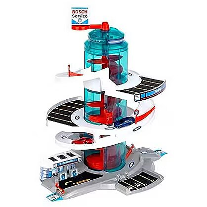 Description - Klein 2899 Garage/Parking "Helix" Garage ''Bosch Car Service Helix'''' with spiral lift that transports cars to the different levels by rotating the spiral - with light and sound effects. The set includes 2 vehicles. Car park with several switches to change direction. Multi-storey car park with ramps and 4 fuel dispensers. The height of the multi-storey car park when assembled is 57 cm. Multi-storey car park in Bosch Car Service design.