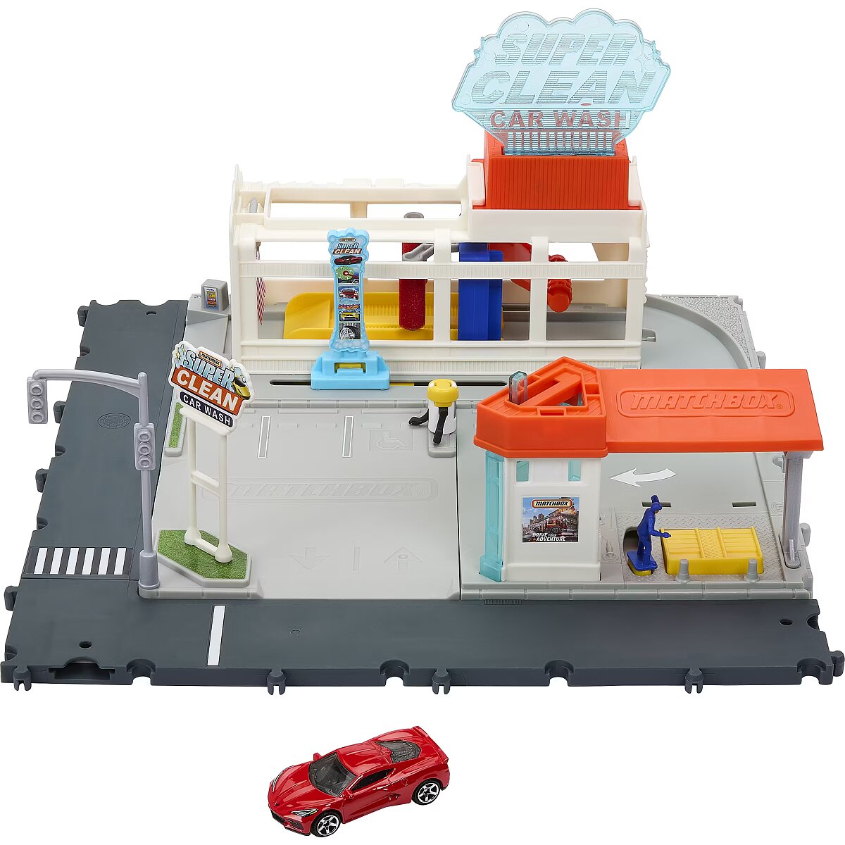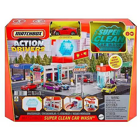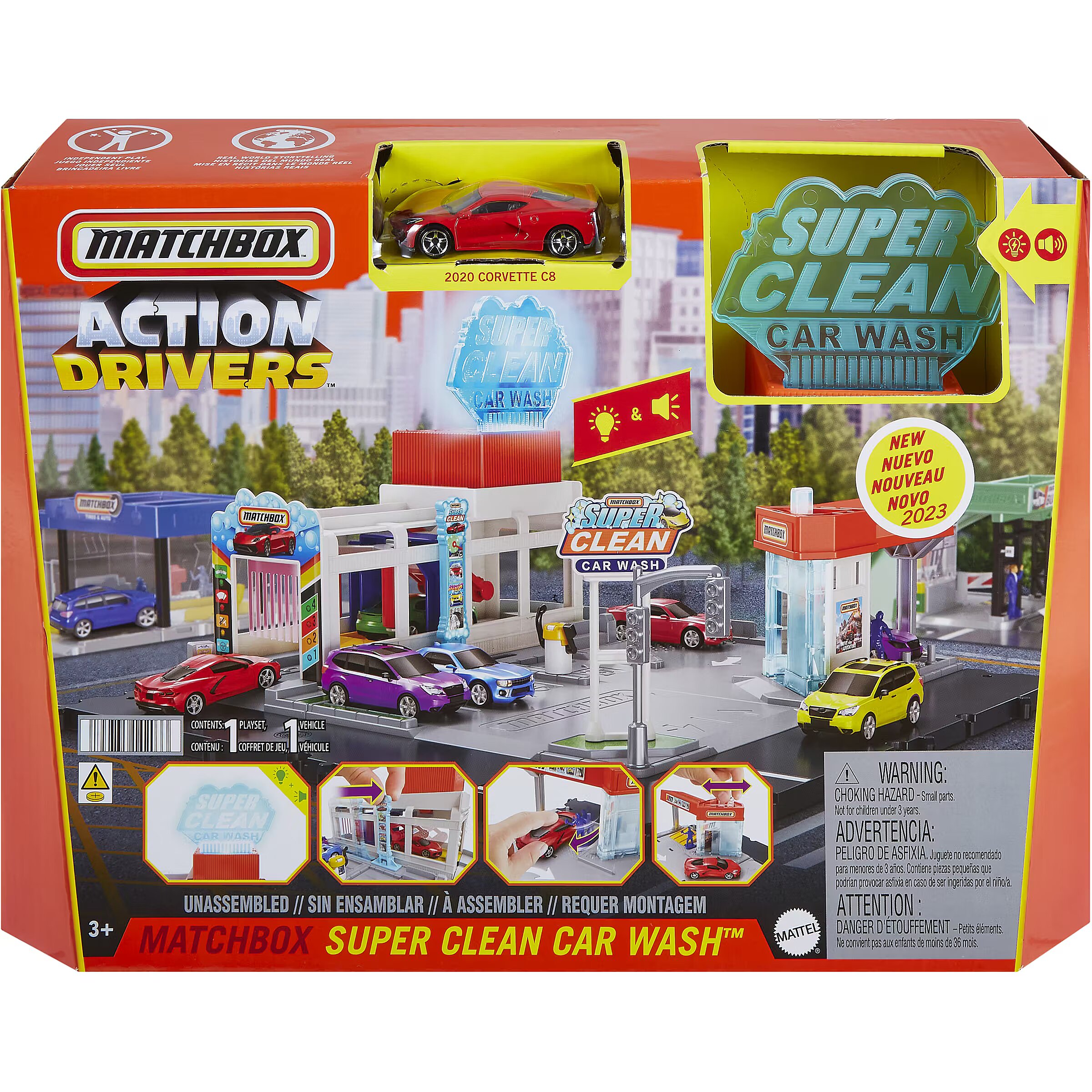 LongDesc - Driving adventures can get messy, and the Matchbox Action Drivers Matchbox Super Clean Carwash Playset can clean things up. Pull into the wax and polish station and a figure automatically moves to make the vehicle look like new. Open the doors to the minimart to grab some snacks, then use the moveable hose to vacuum up the crumbs. The set features lights and sounds that are just like those in real-life carwashes. It includes one Matchbox Chevrolet Corvette and can connect to other sets for extended play. Colours and decorations may vary.