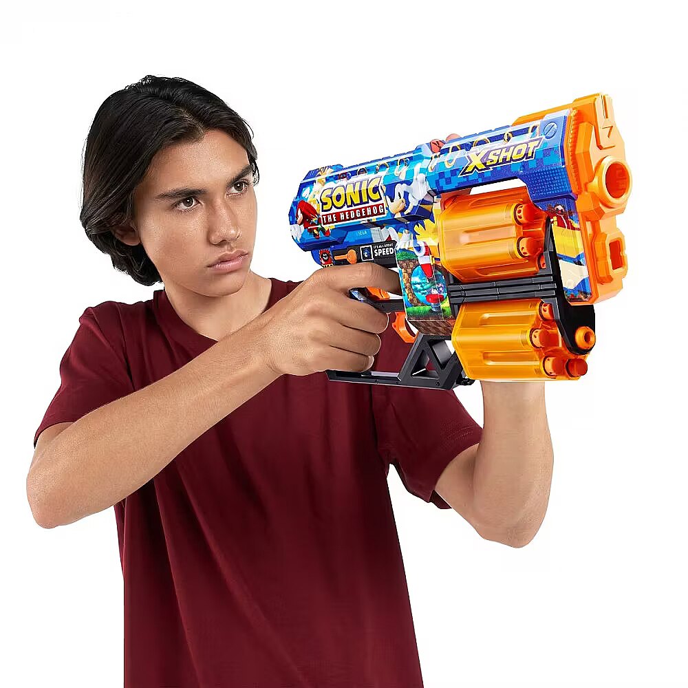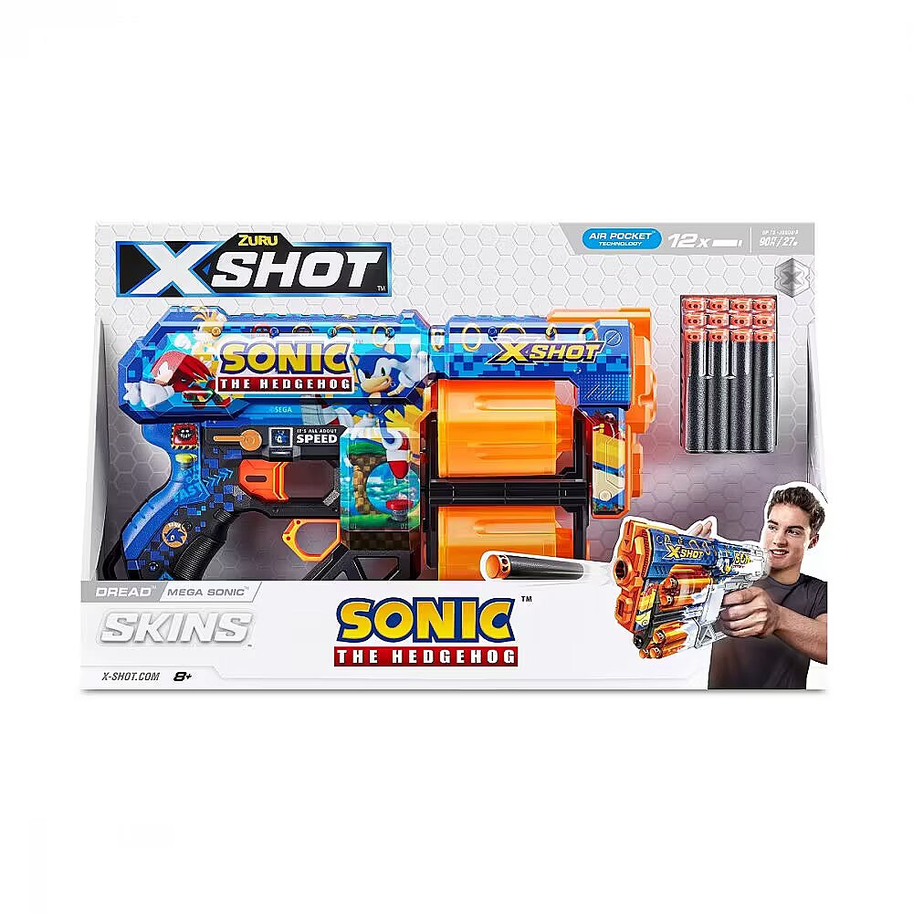 LongDesc - XSHOT SKINS DREAD Mega Sonic, Sonic The Hedgehog Blaster (12 Air Pocket Technology Darts) ZURUSkin your blaster with the super speed of Sonic the Hedgehog! XSHOT SKINS DREAD blaster features a double trouble rotating dual barrel meaning you are always locked and loaded for fun. When you run out of darts in one barrel, switch over to the second one and blast your competition away! The DREAD can hit targets up to 27m / 90 feet away and has a 12 dart capacity. Go NEXT LEVEL with XSHOT and collect all 6 Sonic the Hedgehog Skins!