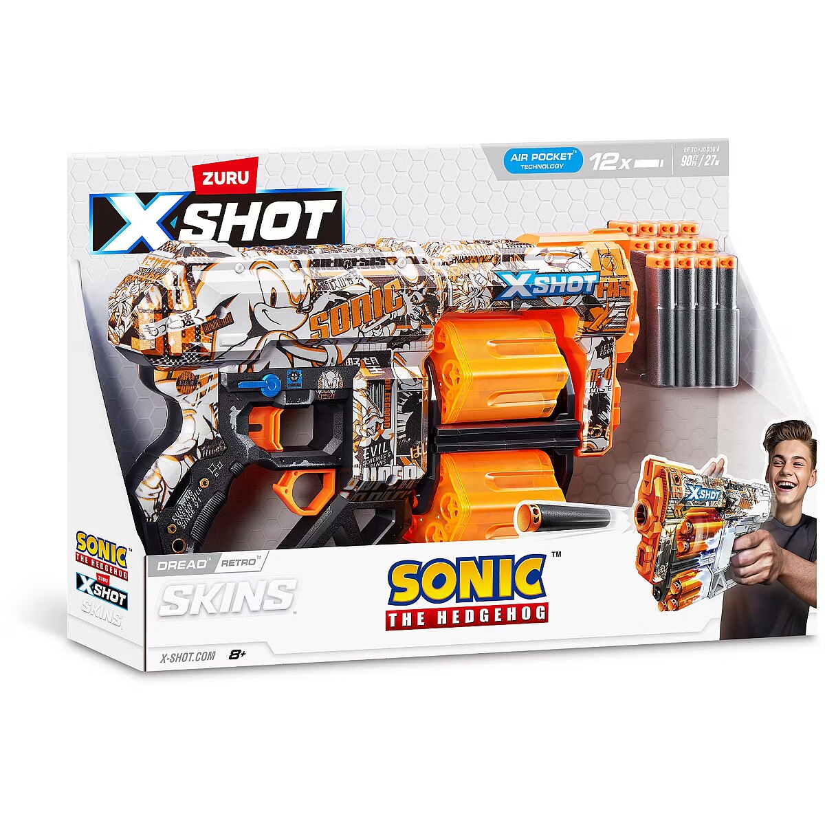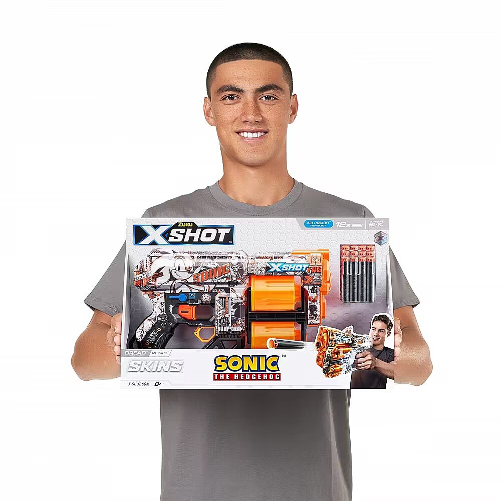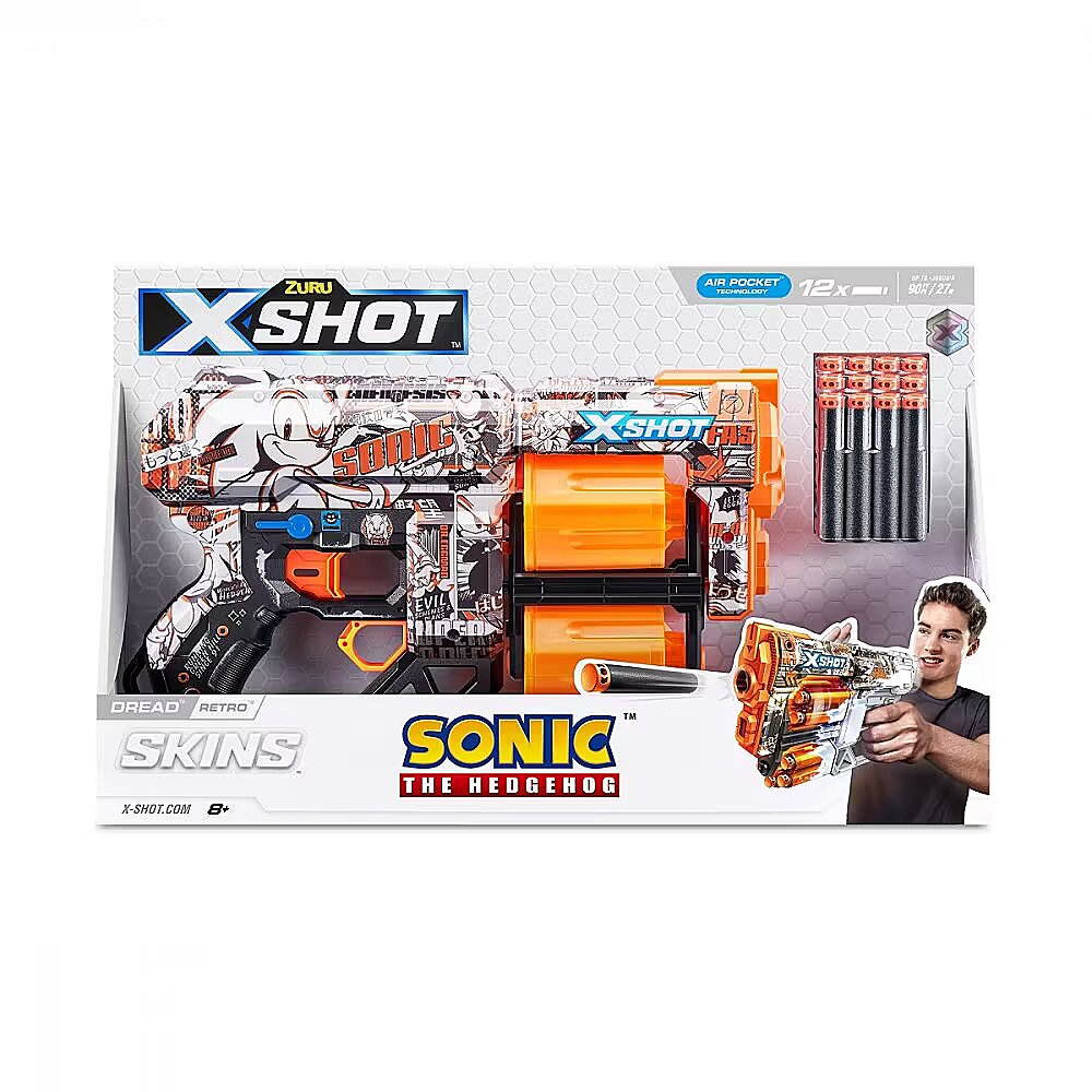 LongDesc - XSHOT SKINS DREAD Retro Sonic The Hedgehog Blaster (12 Air Pocket Technology Darts) ZURUSkin your blaster with the super speed of Sonic the Hedgehog! XSHOT SKINS DREAD blaster features a double trouble rotating dual barrel meaning you are always locked and loaded for fun. When you run out of darts in one barrel, switch over to the second one and blast your competition away! The DREAD can hit targets up to 27m / 90 feet away and has a 12 dart capacity. Go NEXT LEVEL with XSHOT and collect all 6 Sonic the Hedgehog Skins!