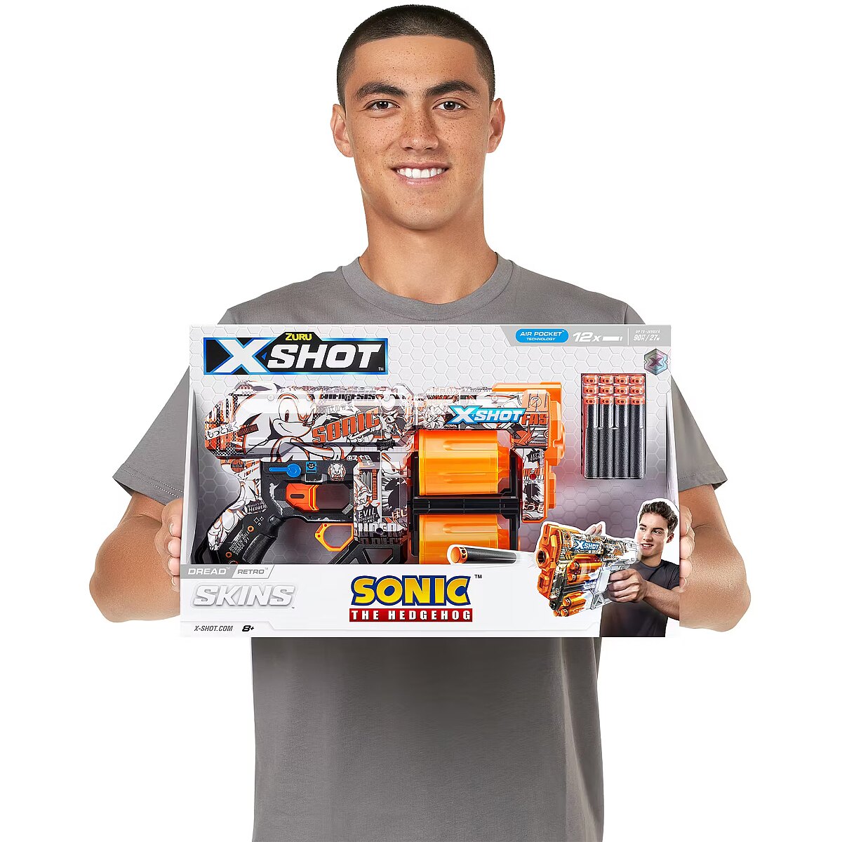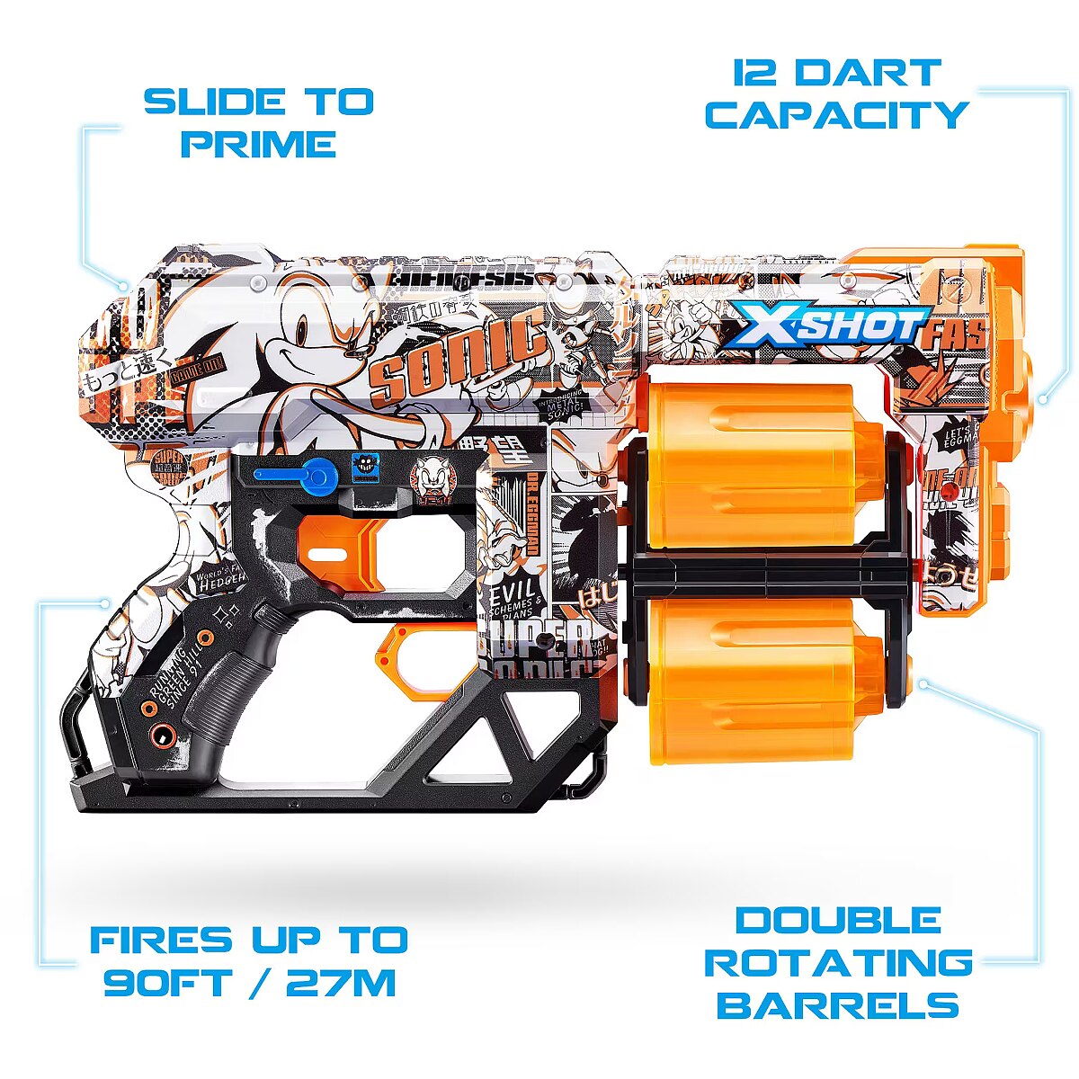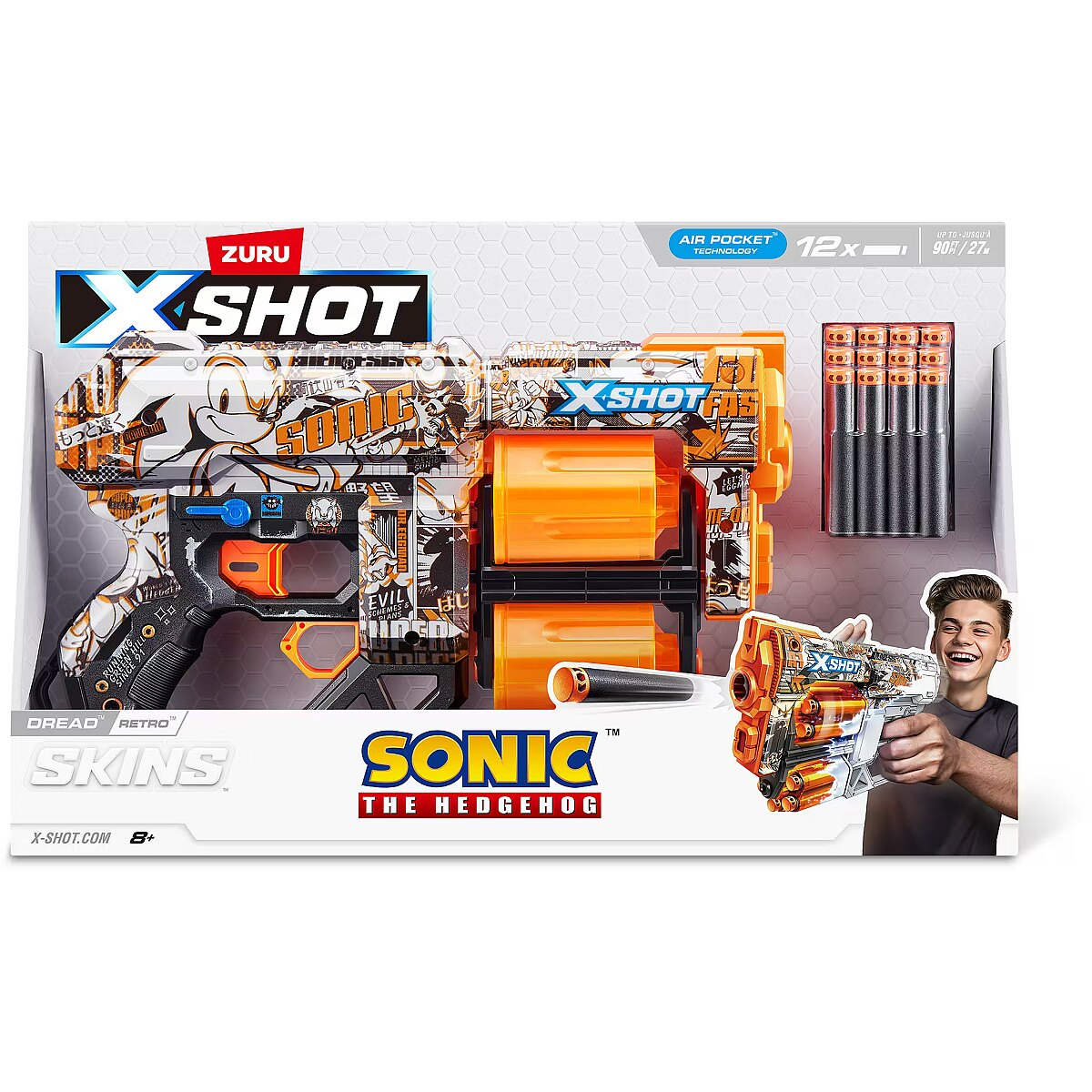 LongDesc - XSHOT SKINS DREAD Retro Sonic The Hedgehog Blaster (12 Air Pocket Technology Darts) ZURUSkin your blaster with the super speed of Sonic the Hedgehog! XSHOT SKINS DREAD blaster features a double trouble rotating dual barrel meaning you are always locked and loaded for fun. When you run out of darts in one barrel, switch over to the second one and blast your competition away! The DREAD can hit targets up to 27m / 90 feet away and has a 12 dart capacity. Go NEXT LEVEL with XSHOT and collect all 6 Sonic the Hedgehog Skins!