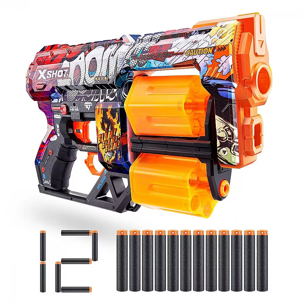 Description - X-SHOT SKINS DREAD BLASTERS, Version A Get into exciting action with X-Shot Skins foam projectile launchers! These are one-of-a-kind toy launchers with colour variations to choose from, just like the skins in the computer game. Collect the entire collection of 7 unique X-Shot Skins launcher skins or choose your favourite design to suit your taste. The X-Shot Skins Dread Boom Launcher Pattern A has cool prints reminiscent of action-packed comic books, so it's sure to appeal to kids and make them feel like a character from their favourite story! Get ready for a real battle with the X-Shot Skins Dread Boom launcher! Two reel magazines equals up to 12 rapid shots, each at a distance of up to 27 metres. Hit your opponents from a distance and enjoy uninterrupted shooting thanks to the improved arrow formula with air pocket technology. It's even faster, more accurate and further shooting. Take the fun to a new level with the new X-Shot Skins launchers! Included with the Dread Boom models is a launcher and a supply of 12 foam arrows for thrilling clashes. The two drum magazines hold up to 12 shells - if one runs out, switch to the other and get back into the action. The offer is for pattern A, inspired by the comic book aesthetic, sure to appeal to boys and girls who love the motley style! The toy is suitable for children aged 8 years and over.