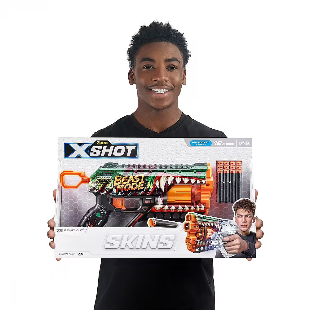 Description - X-Shot Launcher Skins Griefer Beast Out 12 darts Ride into action with the trusty X-Shot Skins Griefer Beast Out. With a 6-round magazine, you'll be ready for any action! Charge up the launcher and shoot projectiles up to 30 m per second! Thanks to special technology, the best quality X-Shot launchers ensure accuracy, durability and precision. X-Shot foam darts use air pockets to fly even further and hit your opponents more accurately! Blast your way to victory in beautiful Beast Out style! With this reliable equipment you will defeat any enemy. The foam dart blaster shoots up to 27m. The X-Shot Skins Griefer launcher comes in 6 unique skins to choose from - collect them all (sold separately)! Start your collection or complete it with the unique X-Shot Skins Griefer Beast Out launcher. The set includes a toy blaster and a supply of 12 foam X-Shot safety darts. Ammunition fits most launchers from leading brands. A great toy that encourages active outdoor play! Intended for children from 8 years of age.