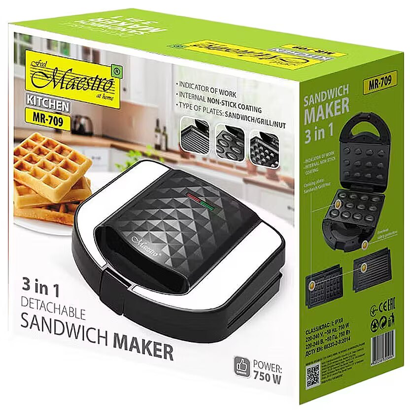 Description - The Maestro MR-709 sandwich maker is a versatile kitchen appliance that allows you to prepare delicious sandwiches, waffles, cookies, and nut-shaped biscuits. The device has a power of 750 W, ensuring fast and efficient heating. The set includes 3 interchangeable plates: grill, waffle, and nut-biscuit plates, which makes it highly functional. The housing is made of plastic combined with steel, providing durability and an attractive appearance. The plates measure 21.5 × 11.5 cm, allowing you to prepare generous portions of food. The power cord is 65 cm long, making it easy to connect the appliance to a kitchen outlet. The dimensions of the sandwich maker are 22 × 22 × 8.5 cm, making it compact and easy to store.