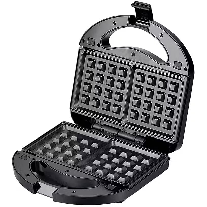 Iekļautie piederumi - 3 × maināmas plāksnes: grils, vafeļu cepējs, riekstu formas cepumi