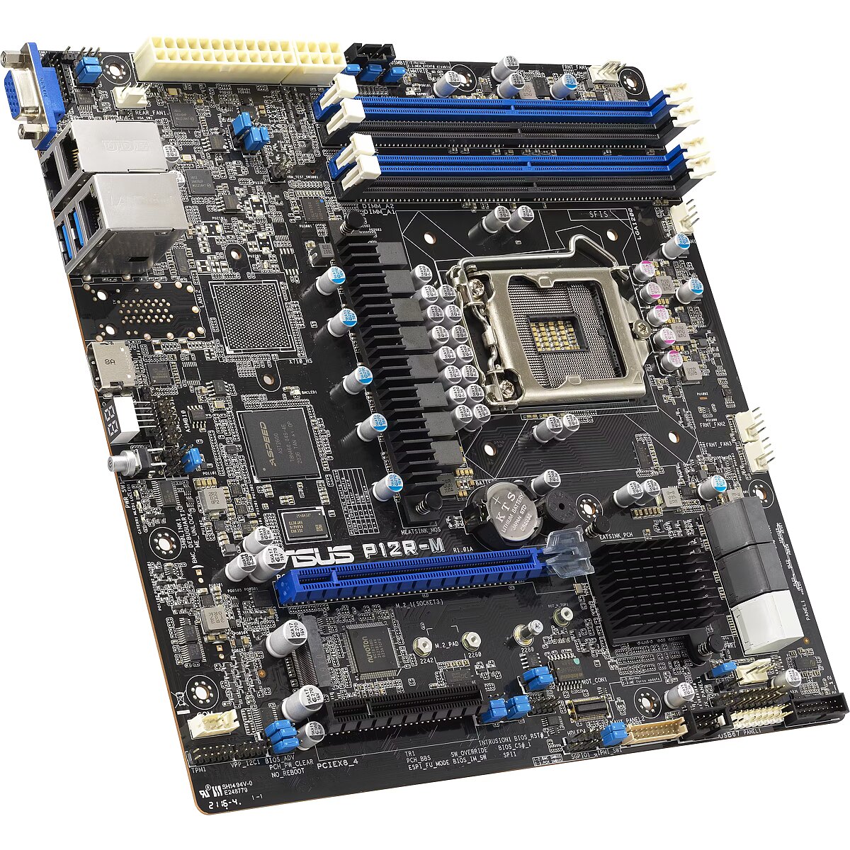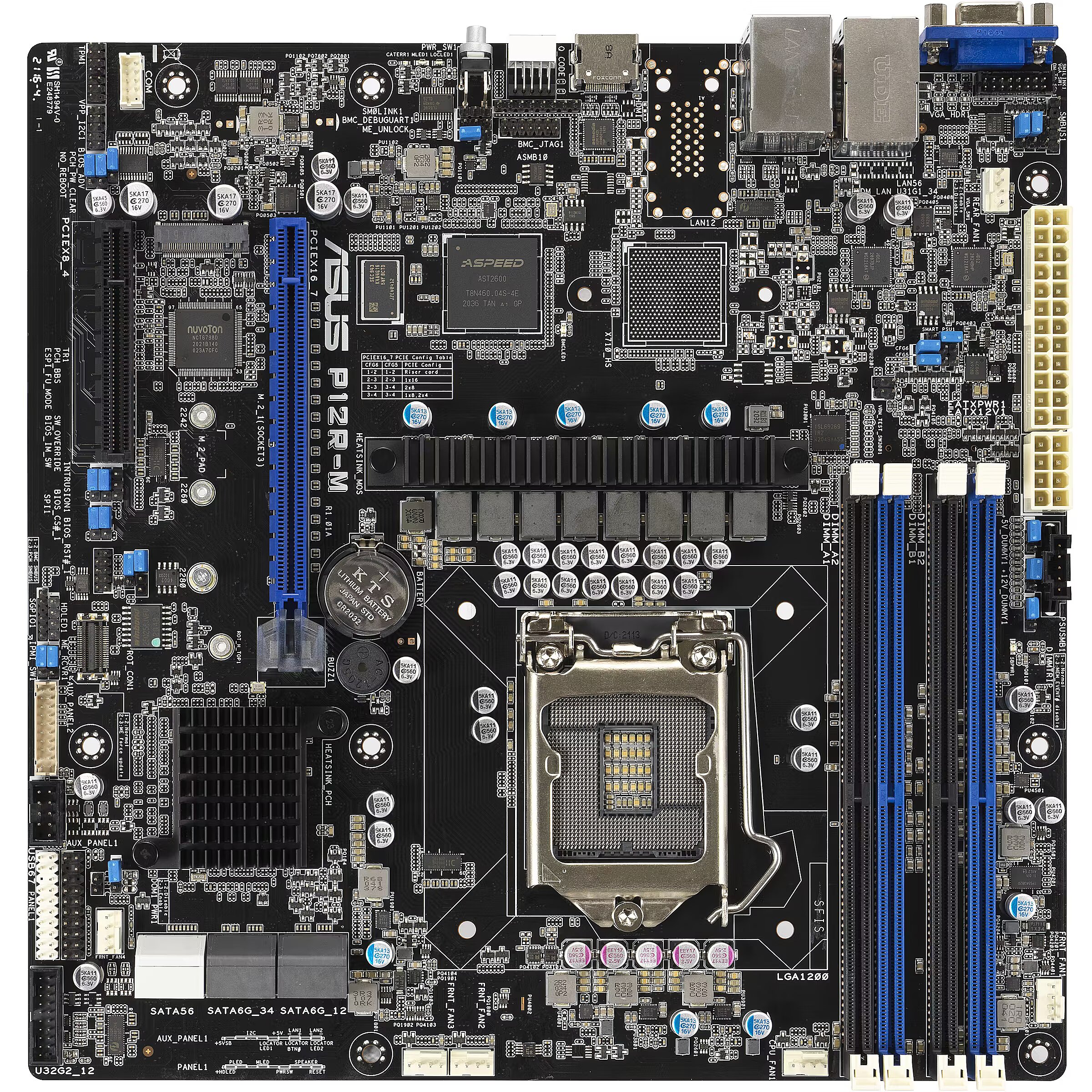 LongSummaryDescription - ASUS P12R-M. Processor manufacturer: Intel, Processor socket: LGA 1200 (Socket H5), Compatible processor series: Intel® Pentium®, Intel Xeon E. Supported memory types: DDR4-SDRAM, Maximum internal memory: 128 GB, Memory slots type: DIMM. Supported storage drive interfaces: M.2, SATA III, Supported storage drive types: HDD & SSD. Graphics card family: ASPEED, Graphics card: AST2600, On-board graphics card model: Aspeed AST2600. Ethernet interface type: Gigabit Ethernet, LAN controller: Intel® I210-AT
