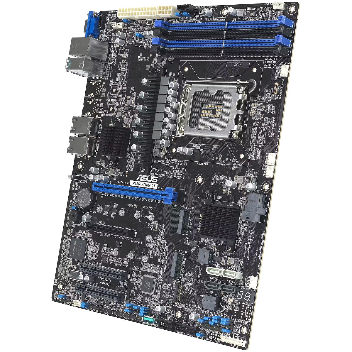 LongDesc - ASUS P13R-E/10G-2T is an Intel® Xeon® E-2400 and Intel® Xeon® 6300 LGA 1700 ATX server motherboard with four DDR5 ECC UDIMM slots, two M.2 slots, dual 10 Gb LAN ports, eight SATA ports, two PCIe® 5.0 slots and two PCIe® 4.0 slots, four USB 10Gbps ports, two USB 2.0 ports and an onboard ASUS ASMB11-iKVM management module.PCIe 5.0 ReadyFaster storage, graphics and networking capabilities PCI Express® (PCIe®) 5.0 delivers 32GT/s bandwidth. The ASUS P13R-E/10G-2T supports both PCIe® 4.0 and 5.0 for better LAN scalability and backwards compatibility to satisfy the increasing workloads for modern data center.Intel Xeon E-2400 processors/Intel Xeon 6300 processorsDesigned for small- to medium-sized businesses (SMBs) and cloud-service providers, offering robust and secure solutions. These processors support up to eight cores and 16 threads, with a maximum frequency of 5.6 GHz and a 95 W TDP, ensuring rapid data processing and application responsiveness. They support up to 128 GB of DDR5 4400 MT/s memory (Intel Xeon E-2400) or up to 4800 MT/s memory (Intel Xeon 6300) and PCIe 5.0 interfaces, providing server-grade 24/7 reliability for business-critical services and customer data, and cost-effective performance for entry-level bare-metal cloud services.Four fast USB 3.2 Gen 2 portsASUS P13R-E/10G-2T is equipped with four USB 3.2 Gen 2 ports on its rear I/O panel. These high-speed connections offer rapid data-transfer speeds of up to 10 Gbps, for fast, efficient and reliable file transfers. These sockets are also backward compatible, ensuring seamless connectivity with a wide range of USB devices.Dual Ethernet bandwidthWith dual onboard LAN powered by an Intel X710-AT2 Ethernet controller, P13R-E/10G-2T server motherboards provide business-grade connectivity and support high-density, high-bandwidth, low-latency access-layer networks to ensure faster transfers of large-size files used in data-intensive applications.Versatile Memory and SSD IntegrationThe P13-E/10G-2T boasts eight SATA ports and four DDR5 ECC UDIMM Memory slots, delivering up to 128 Gbps performance and incorporates two M.2 22110 slots for faster OS booting. This integration services as accelerators for virtualized workloads, boosting the server productivity.Comprehensive IT infrastructure managementP13R-E/10G-2T features an embedded iKVM module and is optionally equipped with ASUS Control Center, offering comprehensive out-of-band and in-band management features tailored for small and mid-size businesses. The embedded ASUS ASMB11-iKVM module supports remote BIOS updates, fan control, standalone KVMs, video recording and BSOD capture, providing around-the-clock remote monitoring and diagnostics. This functionality remains accessible even if the operating system is down or offline, through a user-friendly web-based graphical interface compatible with all major browsers. ASUS Control Center (ACC) further enhances IT infrastructure management, centralizing and integrating monitoring and control for ASUS commercial products, including servers, workstations, and digital signage. ACC enables remote BIOS updates, mobile device system monitoring, and simplified server management through one-click software updates and dispatching.