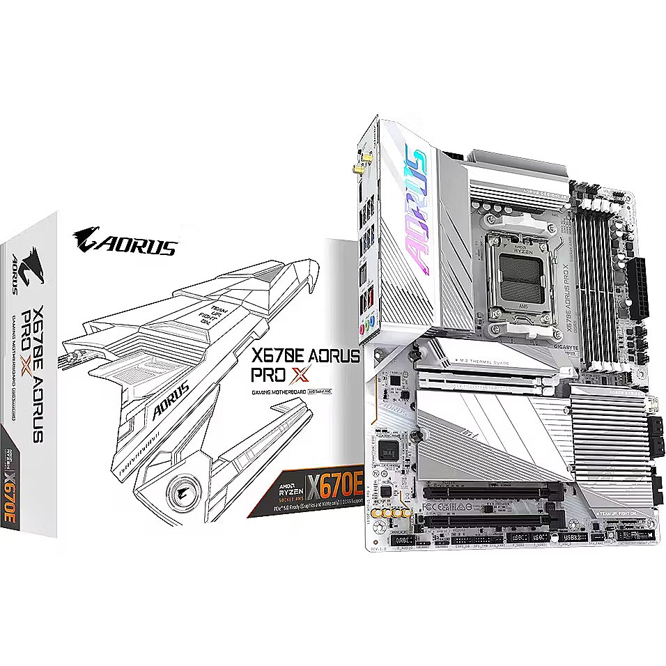 ShortSummaryDescription - GIGABYTE X670E AORUS PRO X Motherboard - Supports AMD Ryzen 7000 CPUs, 16+2+2 phases VRM, up to 8000MHz DDR5 (OC), 4xPCIe 4.0 M.2, Wi-Fi 7, 2.5GbE LAN, USB 3.2 Gen 2, AMD, Socket AM5, AMD Ryzen 7000 Series, Socket AM5, 192 GB, DDR5-SDRAM