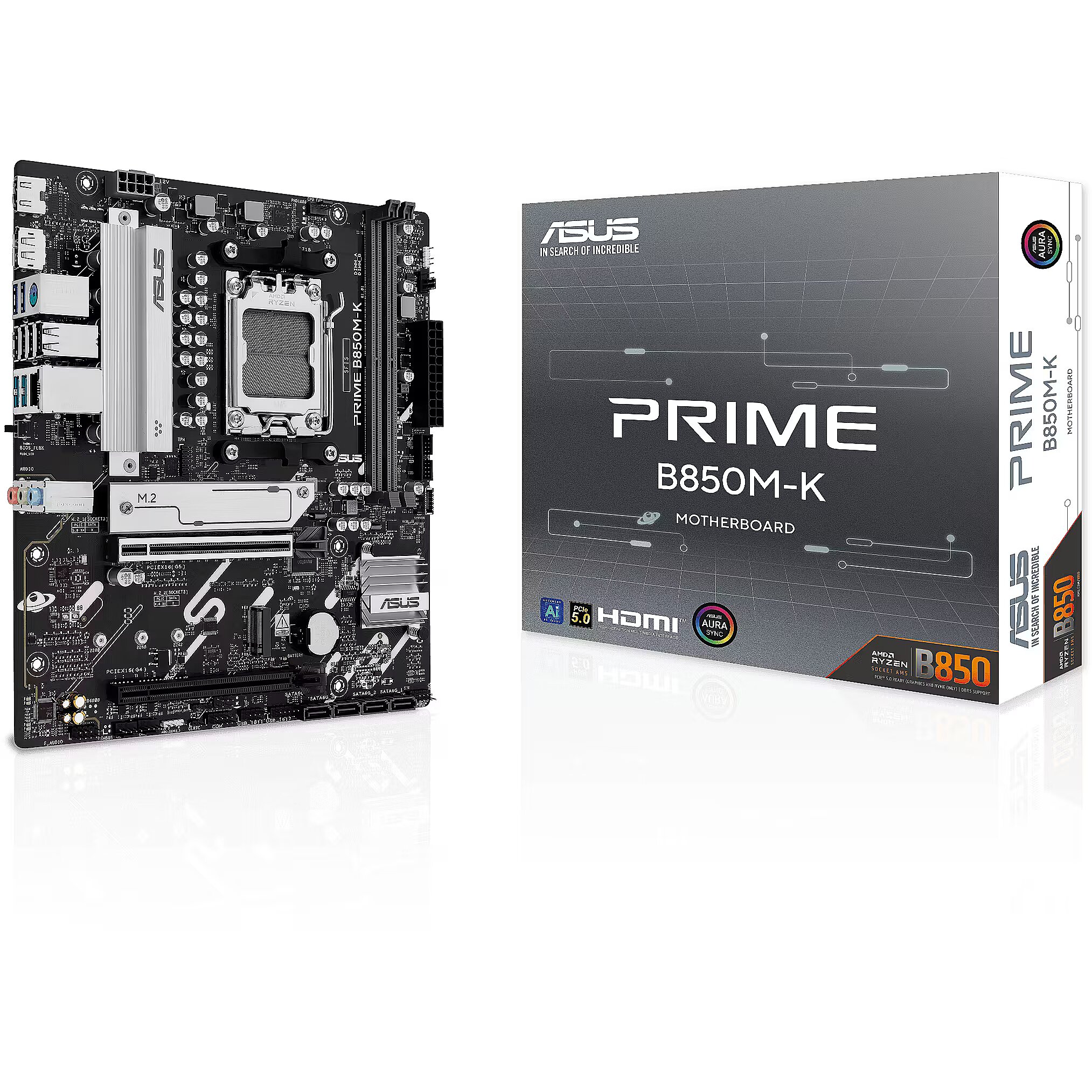 LongSummaryDescription - ASUS PRIME B850M-K. Processor manufacturer: AMD, Processor socket: Socket AM5, Compatible processor series: AMD Ryzen 7000 Series, AMD Ryzen 8000 Series, AMD Ryzen 9000 Series. Supported memory types: DDR5-SDRAM, Maximum internal memory: 128 GB, Memory slots type: DIMM. Supported storage drive interfaces: M.2, SATA III, Supported storage drive types: HDD & SSD, RAID levels: 0, 1, 5, 10. Ethernet interface type: 2.5 Gigabit Ethernet. Component for: PC, Motherboard form factor: micro ATX, Motherboard chipset family: AMD