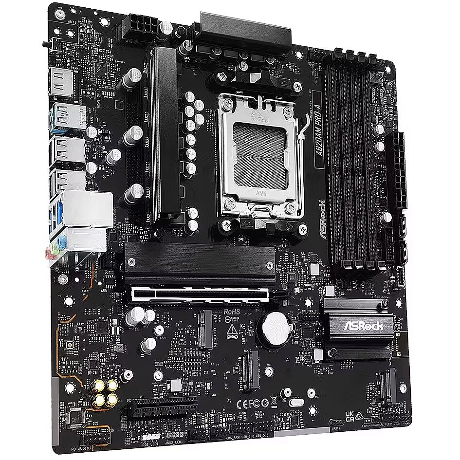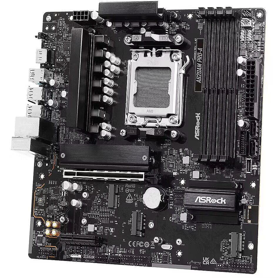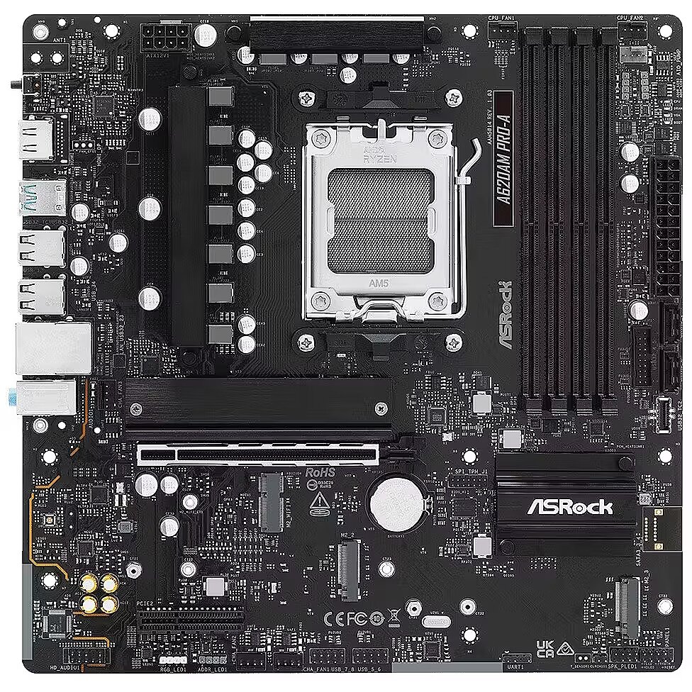 description_lv - ASRock A620AM Pro‑A ir kompakta micro‑ATX mātesplate ar AMD A620A čipkopu un AM5 ligzdu. Tā paredzēta vispārējām un spēļu sistēmām ar Ryzen 7000+ sērijas CPU. Pēc aprīkojuma – četri DDR5 DIMM sloti, trīs M.2 vietas, HDMI video izeja un mūsdienīgs portu klāsts, nodrošina pieejamu un efektīvu risinājumu būvniecībai. Tehniskā specifikācija: Form-faktors: micro‑ATX Ligzda: AM5 (Ryzen 7000 sērija un jaunāki) Čipkopa: AMD A620A Atmiņa: DDR5, līdz 256 GB, 4 × DIMM Video izeja: HDMI × 1 Paplašināšanas sloti (PCIe): 1 × x16, 1 × x4 Datu uzglabāšana: 3 × M.2, 2 × SATA III USB porti: 4 × USB 2.0, 3 × USB 3.0, 1 × USB‑C Audio: Analogas izejas/internetes pieslēgvietas (3-pin) Tīkls: Gigabit Ethernet RAID: Atbalstīts