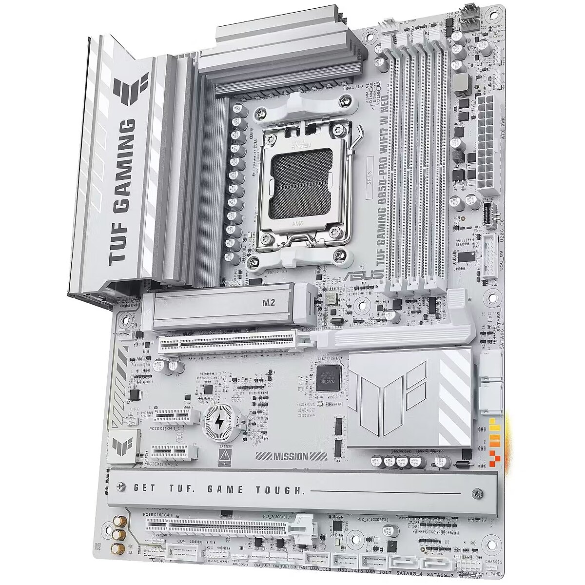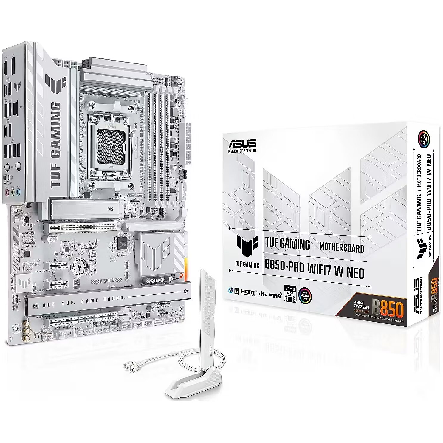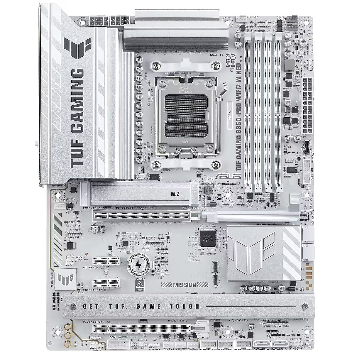 LongDesc - TUF GAMINGB850-PRO WIFI7 W NEOASUS TUF GAMING B850-PRO WIFI7 W NEO takes all the essential elements of the latest AMD Ryzen™ processors and combines them with game-ready features and proven durability. Engineered with an upgraded power solution and a comprehensive cooling system, this motherboard goes beyond expectations with rock-solid and stable performance for marathon gaming. TUF GAMING motherboards also undergo rigorous endurance testing to ensure that they can handle conditions where others may fail. This platform delivers the power and connectivity that advanced AI PC applications demand.