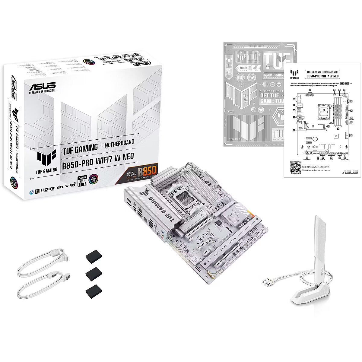 LongSummaryDescription - ASUS TUF GAMING B850-PRO WIFI7 W NEO. Processor manufacturer: AMD, Processor socket: Socket AM5, Compatible processor series: AMD Ryzen 9000 Series, AMD Ryzen 8000 Series, AMD Ryzen 7000 Series. Supported memory types: DDR5-SDRAM, Maximum internal memory: 256 GB, Memory slots type: DIMM. Supported storage drive interfaces: M.2, SATA III, Supported storage drive types: HDD & SSD, RAID levels: 0, 1, 5, 10. Ethernet interface type: 2.5 Gigabit Ethernet, Top Wi-Fi standard: Wi-Fi 7 (802.11be), Wi-Fi standards: Wi-Fi 7 (802.11be). Component for: PC, Motherboard form factor: ATX, Motherboard chipset family: AMD