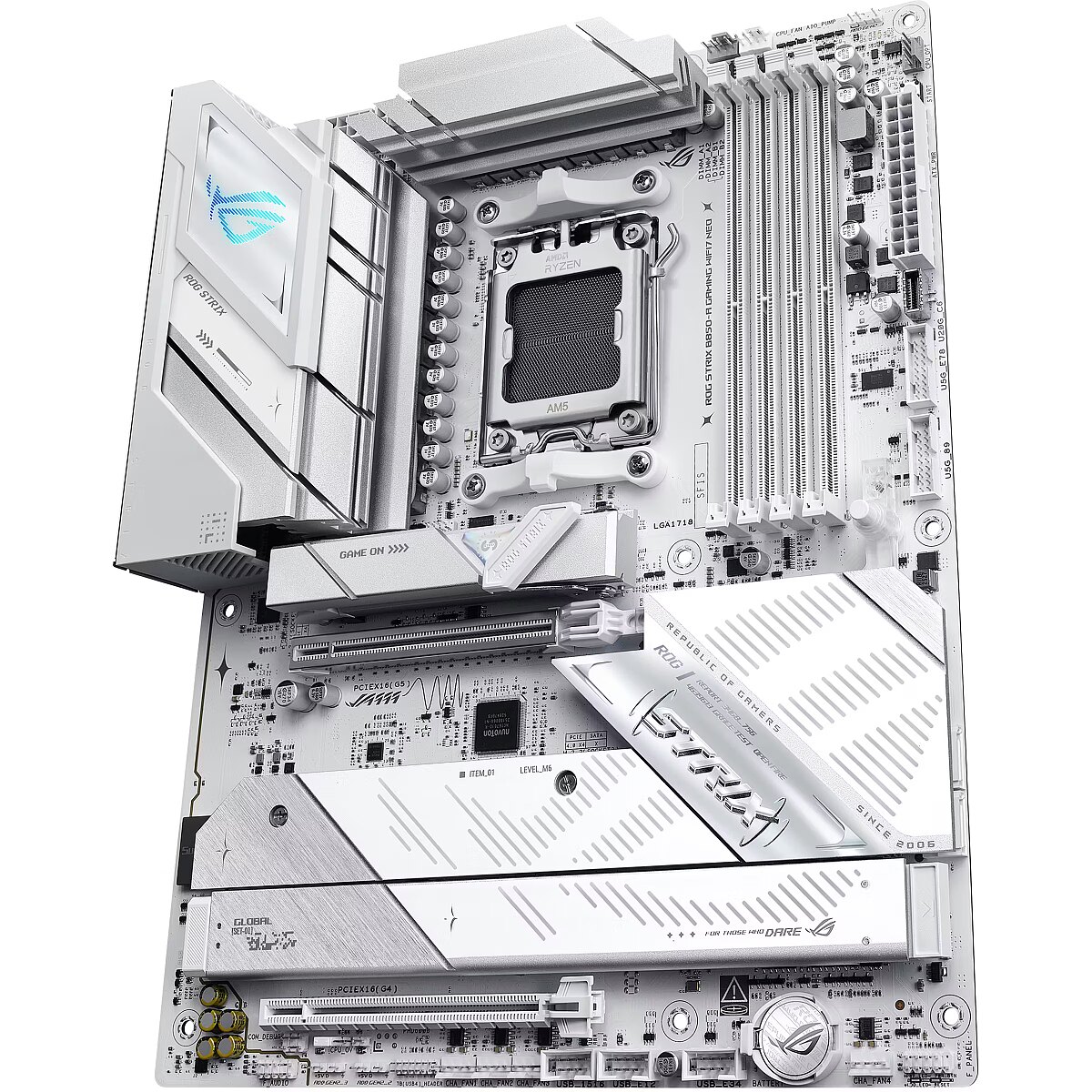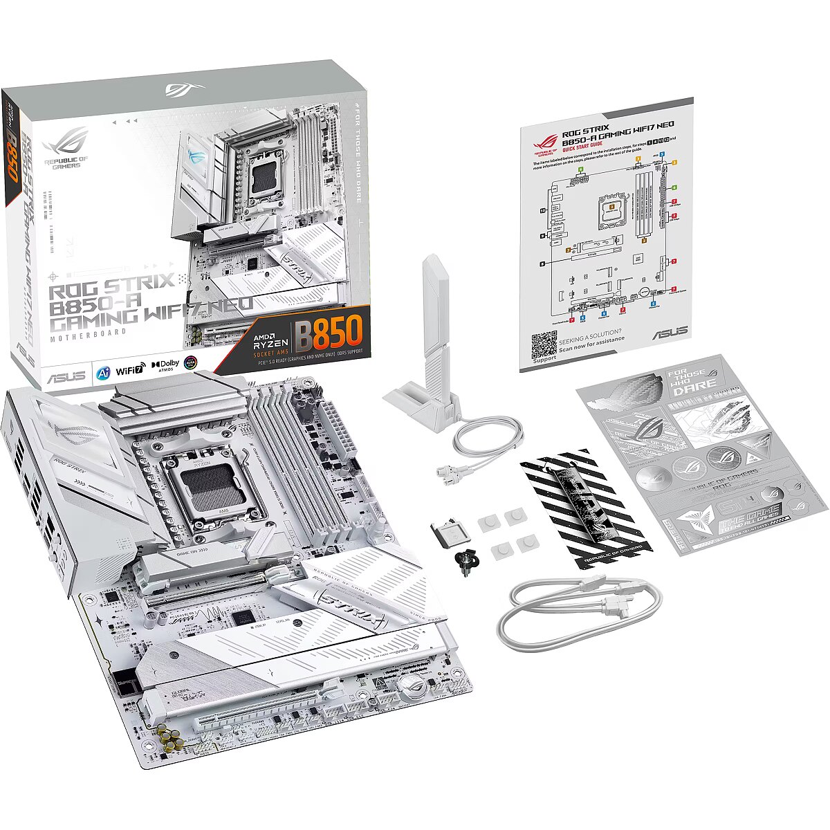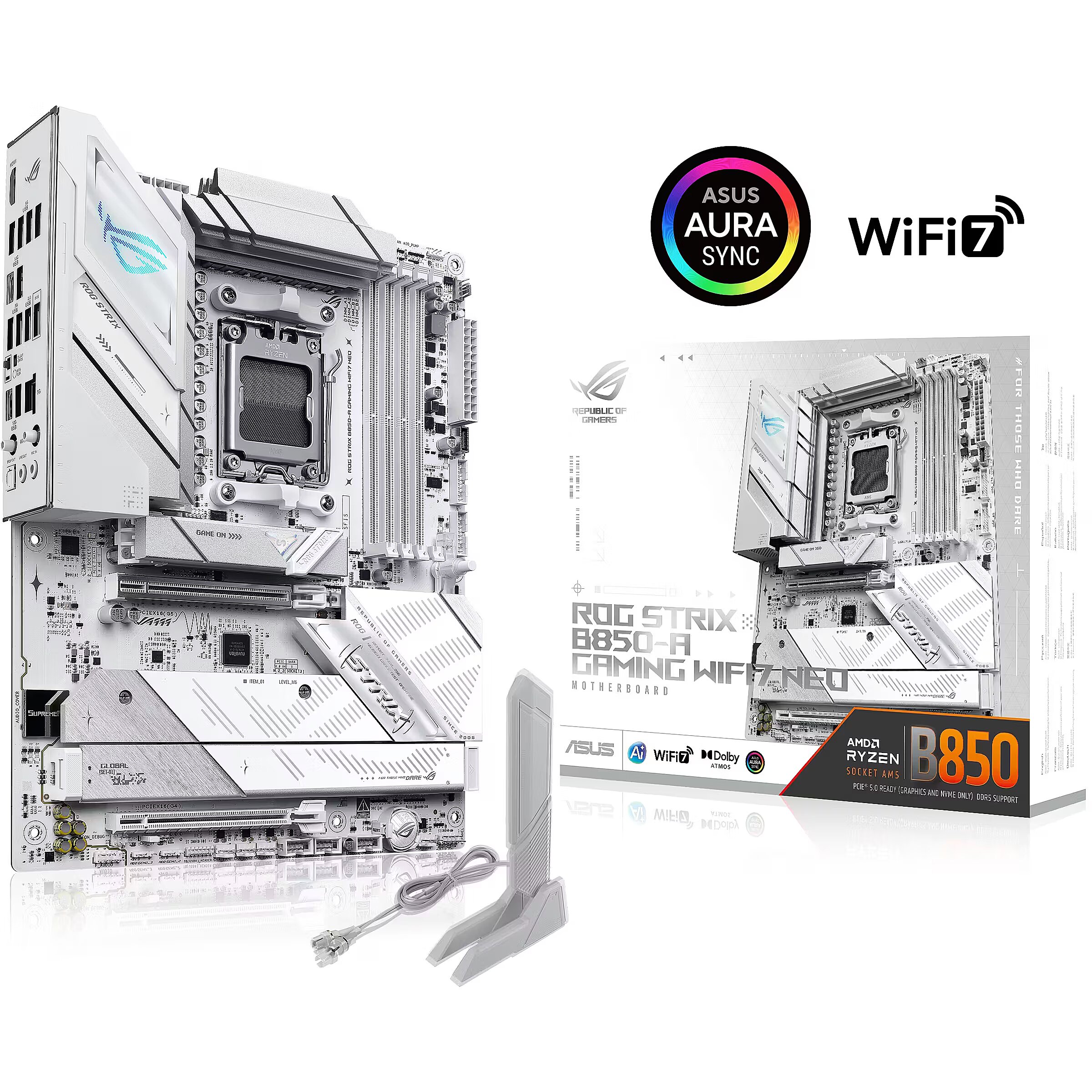 LongDesc - The ROG STRIX B850-A GAMING WIFI7 Neo motherboard features a sleek white PCB and support for AMD Ryzen™ 9000, 8000, 7000 Series processors, delivering smarter performance and faster connectivity for gaming, creation, and everyday use. Powered by AI technologies — including AI Cache Boost, ASUS AI Advisor, AI Networking II, AI Cooling II and AEMP — it offers a streamlined setup and optimized performance. With support for up to 23 USB ports, enhanced memory routing, EZ PC DIY design, 64MB BIOS, and Realtek ® 5G Ethernet, users can enjoy seamless setup, future-ready compatibility, and ultra-fast, stable networking.