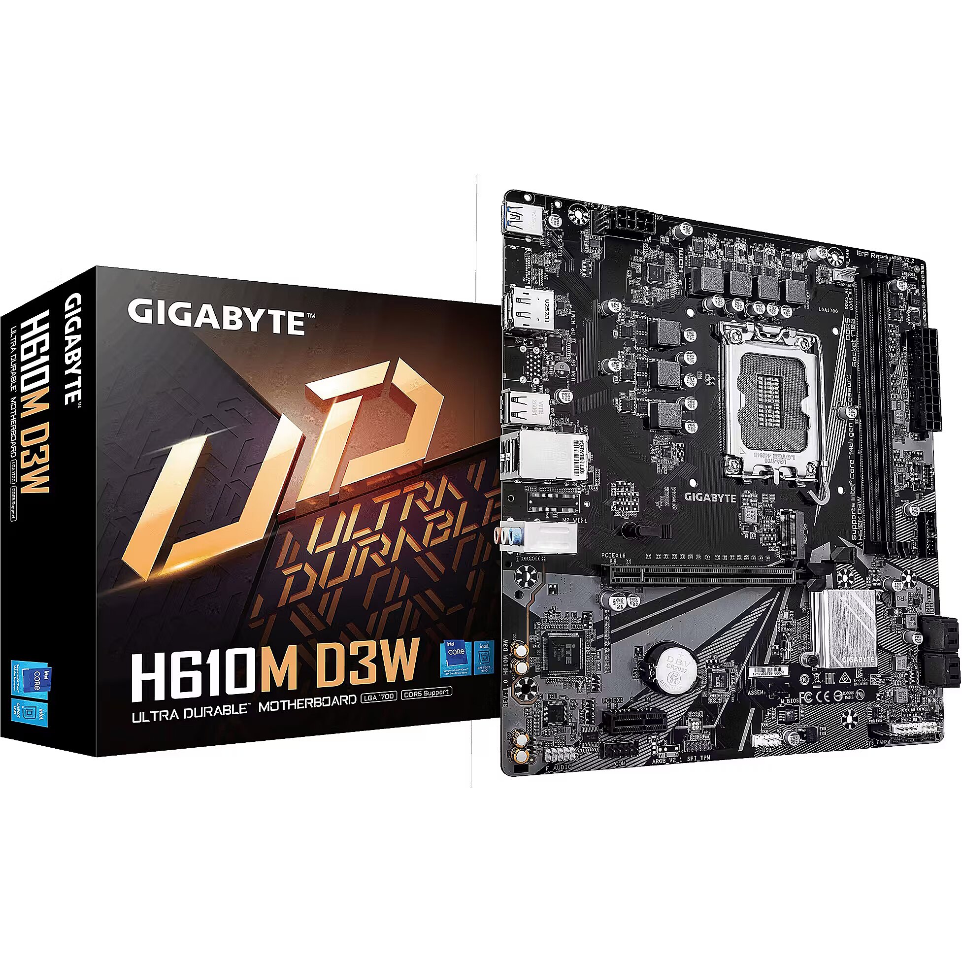 LongSummaryDescription - GIGABYTE H610M D3W Motherboard - Supports 14th Gen. Intel Core CPUs, 5+1+1 phases VRM, up to 5600MHz DDR5, 1xPCIe 3.0 M.2, 1GbE LAN, USB 3.2 Gen 1. Processor manufacturer: Intel, Processor socket: LGA 1700, Compatible processor series: Intel® Celeron®, Intel Core i3 12th Gen, Intel Core i3 13th Gen, Intel Core i3 14th Gen, Intel.... Supported memory types: DDR5-SDRAM, Maximum internal memory: 128 GB, Memory slots type: DIMM. Supported storage drive interfaces: M.2, PCI Express 3.0, SATA III, Supported storage drive types: HDD & SSD. Maximum resolution: 4096 x 2160 pixels. Ethernet interface type: Gigabit Ethernet, LAN controller: Realtek RTL8111H