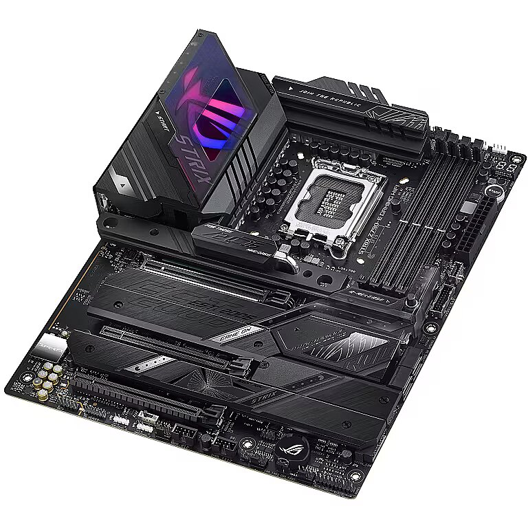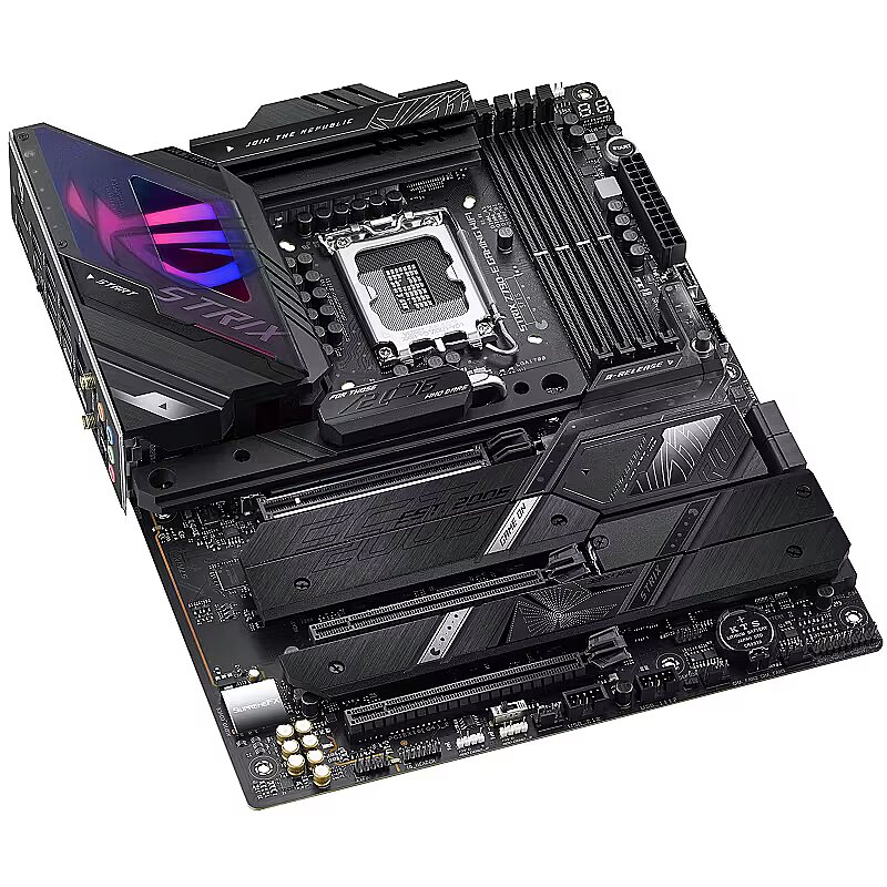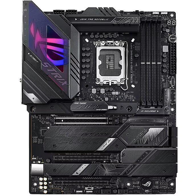LongDesc - Slash the 6GHz barrier in style with the Strix Z790-E. Translucent shrouds outline its RGB ignition panel, alluding to its ability to jump into lightspeed under the guidance of AI Overclocking and a hyper-reactive VRM. DDR5 enhancements and an assortment of PCIe 5.0 options ramp up velocity even further, and setup is a breeze thanks to its unique Q-Design feature set.DIY-FRIENDLY FEATURESPCIE® SLOT Q-RELEASEA physical button unlocks the first PCIe slot’s security latch with one tap, greatly simplifying the process of detaching a PCIe card from the motherboard when it’s time to upgrade to a new GPU or other compatible device.M.2 Q-LATCHThe innovative Q-Latch makes it easy to install or remove an M.2 SSD without the need for specific tools. The design employs a simple locking mechanism to secure the drive and neatly eliminate traditional screws.CLEAR CMOSThe Clear CMOS button quickly resets BIOS settings to factory default. It can also be used to reboot the PC if incorrect BIOS settings have been selected.BIOS FLASHBACK™BIOS FlashBack™ is a safe and simple way to update BIOS. Just drop the (UEFI) BIOS file onto a FAT32-formatted USB stick, plug it into the USB BIOS FlashBack port, and press the button. Updates can even be performed without having memory or a CPU installed.Q-CODEThe on-board LED panel shows 2-digit diagnostic codes, providing a valuable reference for troubleshooting common boot problems and hardware issues.START BUTTONThis convenient button removes the need to manually jump hard-to-reach pins during testing and troubleshooting.ALL-ROUND PERFORMANCEEvery aspect of the Strix Z790-E is finely tuned so the processor, memory, and connected devices can run in lockstep in order to achieve breakneck speeds.AI OVERCLOCKINGTuning is now faster and smarter than ever before. ASUS AI Overclocking profiles the CPU and cooling to predict the optimal configuration and push the system to its limits. Predicted values can be engaged automatically or used as a launching ground for further experimentation.PCIE 5.0Fully embracing the new standard, the Strix Z790-E offers end-to-end PCIe 5.0 support. The topmost x16 expansion slot is Gen 5-ready, and is protected with a SafeSlot retention bracket to bear the weight of the latest graphics cards. One of the onboard M.2 slots is geared for blistering 16 GB/s read and write speeds thanks to its PCIe 5.0 interface, while all the rest can deliver still-impressive 8 GB/s transfers. Every M.2 slot is covered with substantial heatsinks to dispatch the heat of next-gen drives.POWER ARCHITECTURE18 + 1 power stages each rated to 90A deliver ample current to drive the most powerful Intel 13th Gen processors through any workload with ease.ALLOY CHOKES AND DURABLE CAPACITORSHi-end chokes and durable capacitors are engineered to resist extreme temperatures, enabling performance that exceeds industry standards.DUAL 8-PIN PROCOOL II POWER CONNECTORSProCool II connectors are precision-built to ensure flush contact with PSU power lines. A metal sheath improves heat dissipation and lowers electrical impedance.EIGHT-LAYER PCBA multi-layered printed circuit board design quickly dissipates heat around the voltage regulators to improve overall system stability and provide the CPU with more overclocking headroom.DDR5 DOMINATIONROG has a long legacy of flexing the fastest memory performance, and DDR5 is no outlier. Thanks to improved signal routing, now enthusiast-grade kits have been driven far beyond the 7 GT/s mark on the Strix Z790-E, and who knows how far future DIMMs can go? Seasoned veterans can test their mettle by tinkering with the extensive array of tuning options in the UEFI.AEMP IIASUS Enhanced Memory Profile (AEMP) is an exclusive hardware and firmware solution to overclock generic memory modules. AEMP’s second version allows for automatic tuning of kits during system startup and leverages the PCB trace optimizations of the Strix Z790-E to push frequencies higher than ever before. AEMP II can even overclock mixed kits in a quad-DIMM arrangement, and the vast library of support now extends to nearly every DDR5 module that does not otherwise have XMP support.VRM HEATSINK ARRAYCovering the power solution are two thick heatsinks with strategic airflow channels for increased heat dissipation while powering high-performance Intel 13th Gen processors.M.2 COMBO-SINKAn M.2 heatsink with a direct-contact heat pipe efficiently transfers thermal energy away from a mounted drive and into the path of chassis airflow, ensuring optimal operating temperatures.M.2 BACKPLATEAn integrated backplate on the mid-board M.2 slot helps ensure that a high-performance PCIe 5.0 drive can deliver peak performance, even when airflow is restricted.M.2 HEATSINKSHeatsinks cover every slot to help keep onboard NVME SSDs at optimal temperatures for consistent performance and reliability.CPU FAN HEADERSA dedicated pair of PWM/DC fan headers provides easy access to CPU coolers.AIO PUMP FAN HEADERA dedicated PWM/DC header connects self-contained water-cooling setups.4-PIN FAN HEADERSThe Strix Z790-E features five chassis fan headers, each supporting auto-detection of PWM or DC fans.LEADING CONNECTIVITYLightning-fast networking keeps the Strix Z790-E in sync with the outside world for uninterrupted gaming and creation. In addition to breakneck data transfers, connected devices can now top-up quickly thanks to 30W charging support. And SupremeFX audio makes sound clear and punchy to shape truly immersive experiences.WIFI 6EOnboard WiFi 6E technology takes advantage of newly available spectrum in the 6 GHz band to provide up to seven 160 MHz channels for ultrafast throughput and better performance in dense wireless environments.* WiFi 6E availability and features are dependent on regulatory limitations and co-existence with 5 GHz WiFi.Intel 2.5G EthernetLow-latency gaming, speedy file transfers, and high-resolution video streaming are among the many perks of onboard Intel® 2.5 
