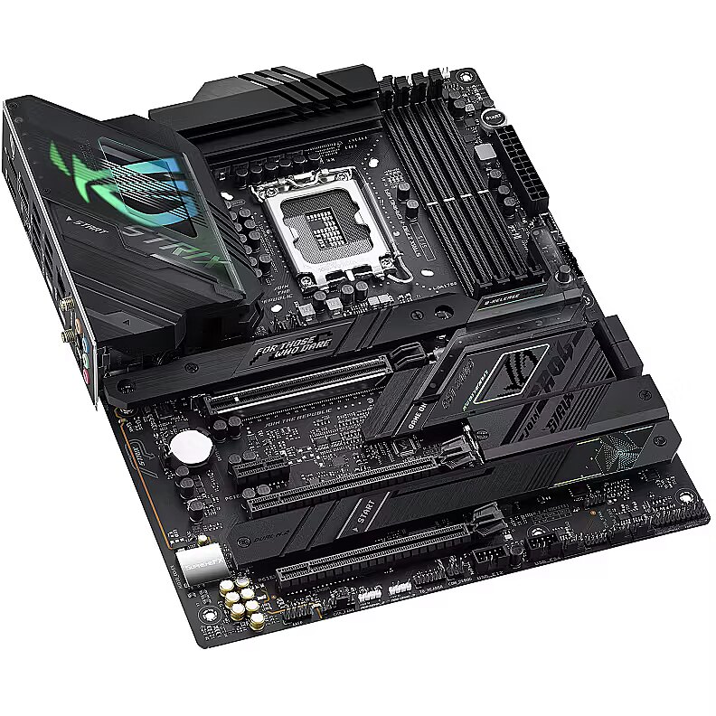 LongDesc - Beneath its dark heatsinks and brooding aesthetic, the ROG Strix Z790-F packs a power solution and overclocking features that push Intel® 13th Gen Core processors to new heights. Flush with advanced thermal management for quieter builds, along with support for DDR5, PCIe 5.0, and WiFi 6E, this well-equipped powerhouse delivers massive bandwidth for everything.DIY-FRIENDLY FEATURESPCIE® SLOT Q-RELEASEA physical button unlocks the first PCIe slot’s security latch with one press, greatly simplifying the process of detaching a PCIe card from the motherboard when it’s time to upgrade to a new GPU or other compatible device.M.2 Q-LATCHThe innovative Q-Latch makes it easy to install or remove an SSD from an M.2 slot. The design employs a simple locking mechanism to secure the drive, eliminating the need for a traditional screw.CLEAR CMOSThe Clear CMOS button quickly resets BIOS settings to factory default. It can also be used to reboot the PC if incorrect BIOS settings have been selected.BIOS FLASHBACK™BIOS FlashBack™ is a safe and simple way to update BIOS. Just drop the (UEFI) BIOS file onto a FAT32-formatted USB stick, plug it into the USB BIOS FlashBack port, and press the button. Updates can even be performed without having memory or a CPU installed.START BUTTONThis convenient button removes the need to manually jump hard-to-reach pins during testing and troubleshooting.Q-LEDFour onboard LEDs indicate power status and identify problems with CPU, memory, graphics card, or boot device for quick diagnosis.ALL-ROUND PERFORMANCERobust power delivery, speedy storage and memory, and comprehensive cooling elevate any build with the ROG Strix Z790-F at its center.AI OVERCLOCKINGTuning is now faster and smarter than ever before. ASUS AI Overclocking profiles the CPU and cooling to predict the optimal configuration and push the system to its limits. Predicted values can be engaged automatically or used as a launching ground for further experimentation.PCIE 5.0The top PCIe 5.0 x16 SafeSlot is well-equipped for the increased size and bandwidth of next-gen graphics cards. Zippy storage options abound with four PCIe 4.0 M.2 slots, all featuring robust heatsinks to maximize performance.POWER ARCHITECTURE16 + 1 power stages rated to 90A each deliver ample current in order to drive 13th and 12th Gen Intel® Core™ Processors through any workload with ease.ALLOY CHOKES AND DURABLE CAPACITORSHi-end chokes and durable capacitors are engineered to resist extreme temperatures, enabling performance that exceeds industry standards.DUAL PROCOOL II POWER CONNECTORSProCool II connectors are precision-built to ensure flush contact with PSU power lines. A metal sheath improves heat dissipation and lowers electrical impedance.SIX-LAYER PCBA multi-layered printed circuit board design quickly dissipates heat around the voltage regulators to improve overall system stability and provide the CPU with more overclocking headroom.DDR5 DOMINATIONROG has a long legacy of flexing the fastest memory performance, and DDR5 is no outlier. Thanks to improved signal routing, now enthusiast-grade kits have been driven far beyond the 7 GT/s mark on the Strix Z790-F, and who knows how far future DIMMs can go? Seasoned veterans can test their mettle by tinkering with the extensive array of tuning options in the UEFI.AEMP IIASUS Enhanced Memory Profile (AEMP) is an exclusive hardware and firmware solution to overclock generic memory modules. AEMP’s second version allows for automatic tuning of kits during system startup and leverages the PCB trace optimizations of the Strix Z790-F to push frequencies higher than ever before. AEMP II can even overclock mixed kits in a quad-DIMM arrangement, and the vast library of support now extends to nearly every DDR5 module that does not otherwise have XMP support.VRM HEATSINK ARRAYCovering the power solution are two thick heatsinks connected by a heatpipe, sharing cooling capacity across VRMs and providing ample surface area and mass to handle the power needs of high-performance Intel 13th Gen processors.M.2 BACKPLATEAn integrated backplate helps ensure that high-performance drives can deliver peak performance, even when airflow is restricted.M.2 HEATSINKSHeatsinks cover every slot to help keep onboard NVME SSDs at optimal temperatures for consistent performance and reliability.CPU FAN HEADERSA dedicated PWM/DC fan header provides easy access to CPU coolers.AIO PUMP FAN HEADERA dedicated PWM/DC header connects self-contained water-cooling setups.4-PIN FAN HEADERSEach header supports auto-detection of PWM or DC fans.LEADING CONNECTIVITYThe ROG Strix Z790-F delivers next-gen connectivity for ultrafast data transfers and low-latency networking. Those perks are joined by an advanced audio solution that allows you to pick out the smallest cues and home in on your opponents.WIFI 6EOnboard WiFi 6E technology takes advantage of newly available spectrum in the 6 GHz band to provide up to seven 160 MHz channels for ultrafast throughput and better performance in dense wireless environments.* WiFi 6E availability and features are dependent on regulatory limitations and co-existence with 5 GHz WiFi2.5G ETHERNETLow-latency gaming, speedy file transfers, and high-resolution video streaming are among the many perks of onboard Intel® 2.5 Gbps Ethernet.USB 3.2 GEN 2X2The Strix Z790-F comes loaded with two USB 3.2 Gen 2x2 Type-C® connectors for speedy data transfers up to 20 Gbps. One is a port on the rear I/O; the other can be attached to the chassis front panel and it also features Power Delivery (PD) 3.0 technology to quickly charge devices up to 30W.SUPREMEFXROG SupremeFX is a unique blend of hardware and software technologies that provide superior audio. The Strix Z790-F implementation features the ALC4080 codec for high-resolution playback up to 32-bit/384 kHz across all channels. Front-panel output is streamed through the integrated Savitech amplifier that can drive high-fidelity acoustics 