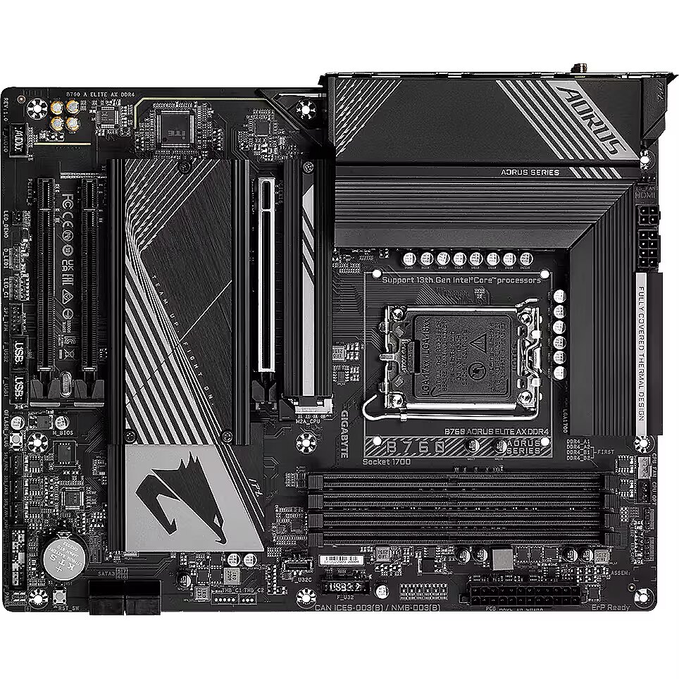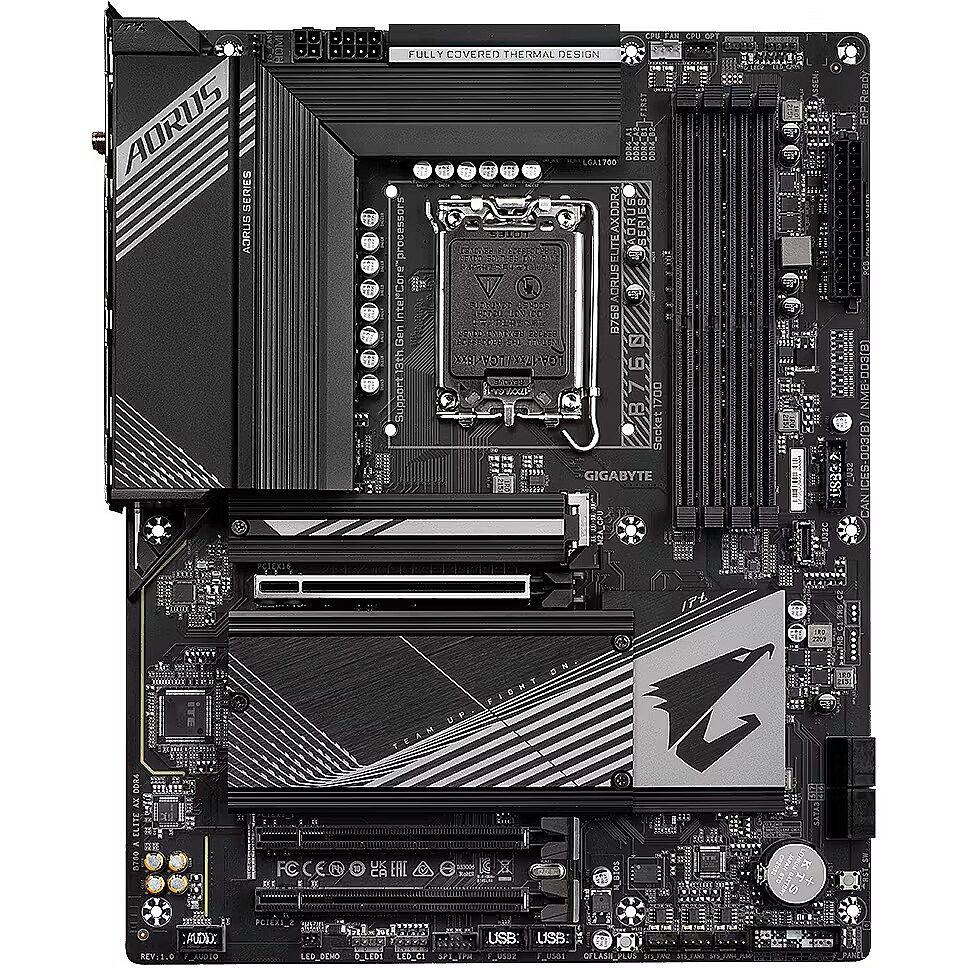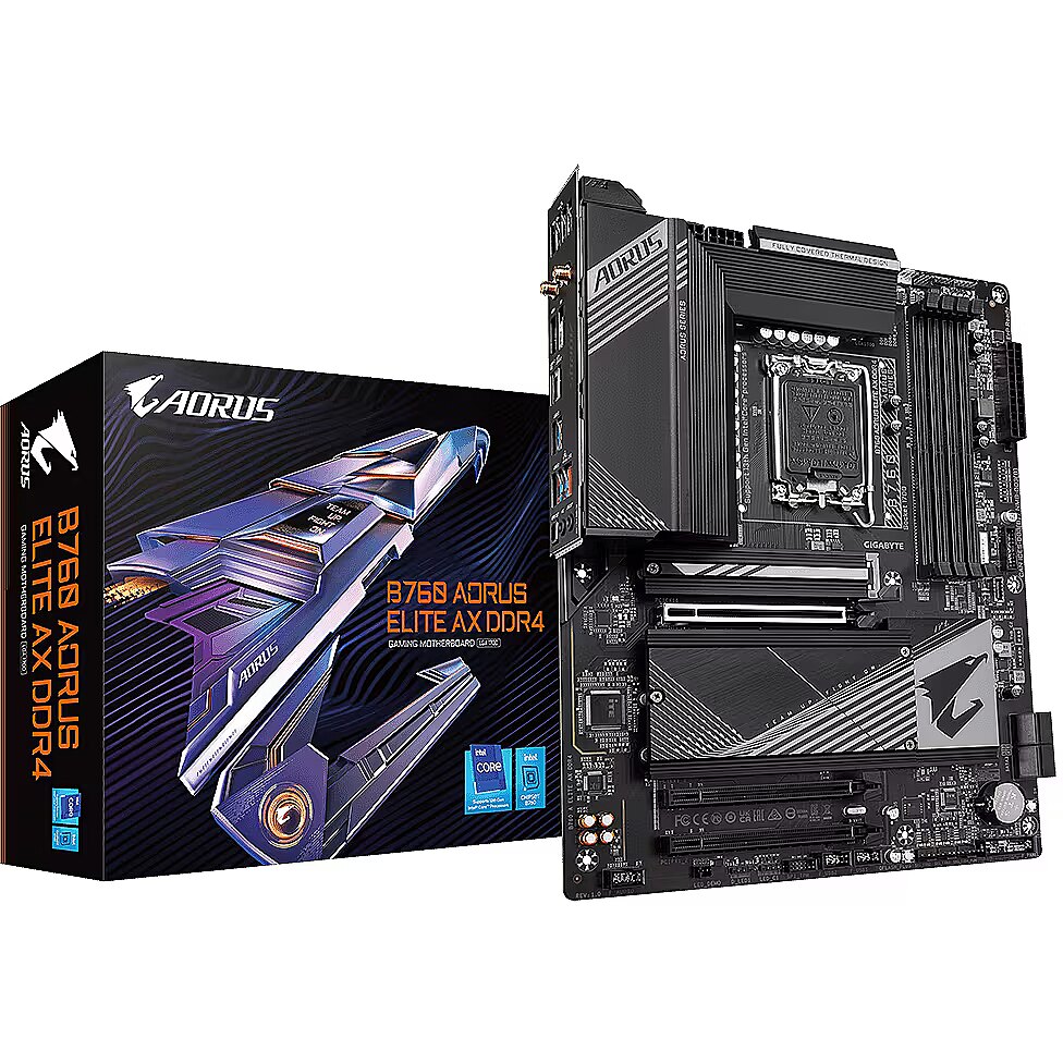 LongSummaryDescription - GIGABYTE B760 AORUS ELITE AX DDR4 Motherboard - Supports Intel Core 14th Gen CPUs, 12*+1+1 Phases Digital VRM, up to 5333MHz DDR4 (OC), 3xPCIe 4.0 M.2, Wi-Fi 6E, 2.5GbE LAN, USB 3.2 Gen 2. Processor socket: LGA 1700, Compatible processor series: Intel® Celeron®, Intel® Pentium® Gold, Supported processor sockets: LGA 1700. Supported memory types: DDR4-SDRAM, Maximum internal memory: 128 GB, Memory slots type: DIMM. Supported storage drive interfaces: M.2, SATA III, Supported storage drive types: HDD & SSD, RAID levels: 0, 1, 5, 10. Graphics card family: Intel, Graphics card: HD Graphics, Maximum resolution: 4096 x 2304 pixels. Ethernet interface type: 2.5 Gigabit Ethernet, Top Wi-Fi standard: Wi-Fi 6E (802.11ax), Wi-Fi standards: 802.11a, 802.11b, 802.11g, Wi-Fi 4 (802.11n), Wi-Fi 5 (802.11ac), Wi-Fi 6E (802.11ax)