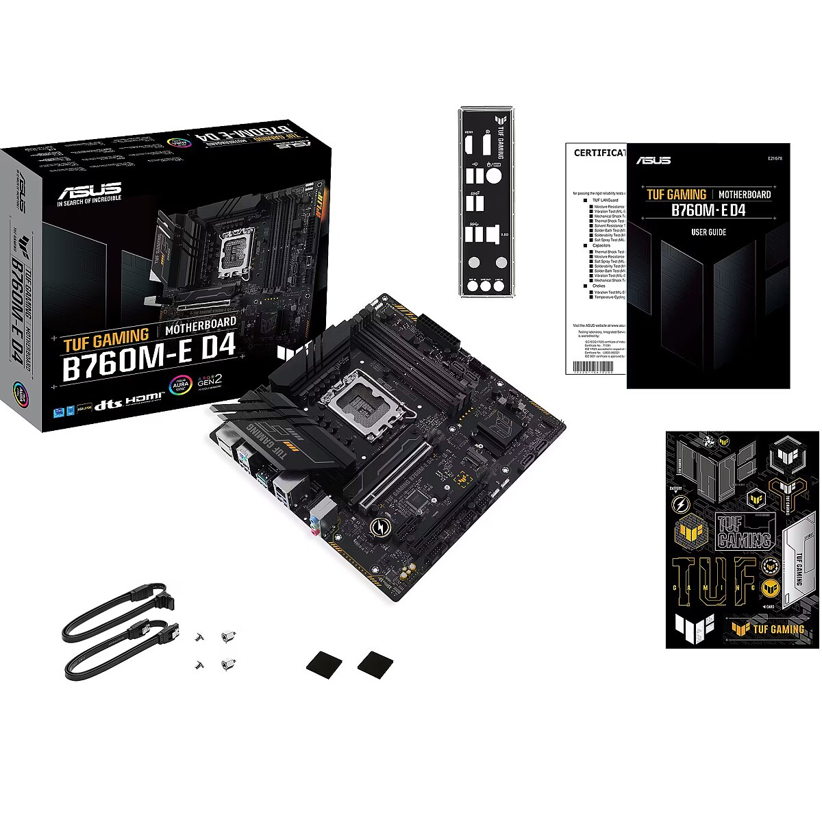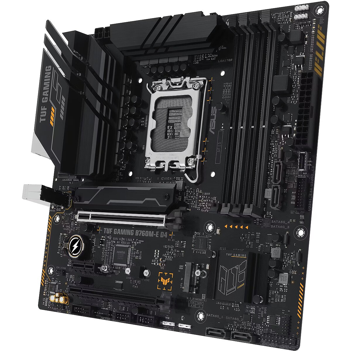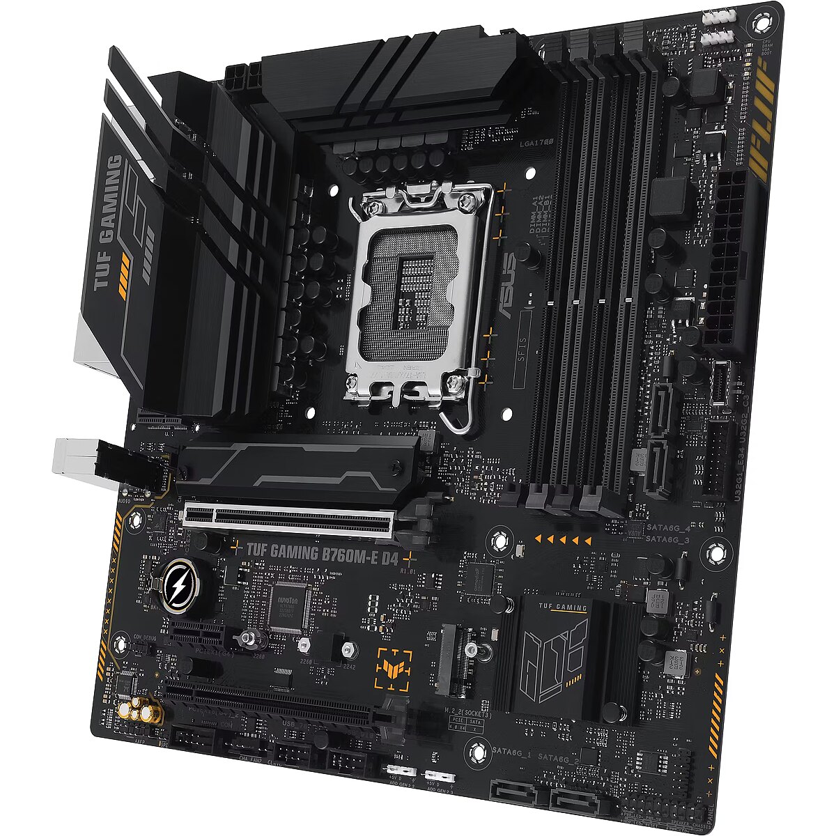 LongSummaryDescription - ASUS TUF GAMING B760M-E D4. Processor manufacturer: Intel, Processor socket: LGA 1700, Compatible processor series: Intel® Celeron®, Intel® Core™ i3, Intel® Core™ i5, Intel® Core™ i7, Intel® Core™ i9,.... Supported memory types: DDR4-SDRAM, Maximum internal memory: 128 GB, Memory slots type: DIMM. Supported storage drive interfaces: M.2, SATA III, Supported storage drive types: HDD & SSD, RAID levels: 0, 1, 5, 10. Ethernet interface type: 2.5 Gigabit Ethernet, Fast Ethernet, Gigabit Ethernet. Component for: PC, Motherboard form factor: micro ATX, Motherboard chipset family: Intel