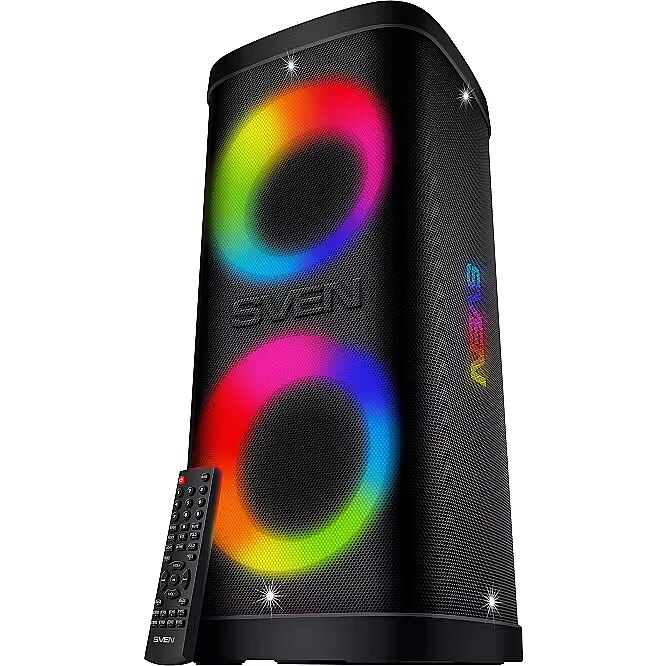 Produkta apraksts - Pārnēsājamais skaļrunis SVEN PS-930, melns, izejas jauda 2x75W (RMS), TWS, Bluetooth, FM, USB, microSD, LED displejs, litija akumulators