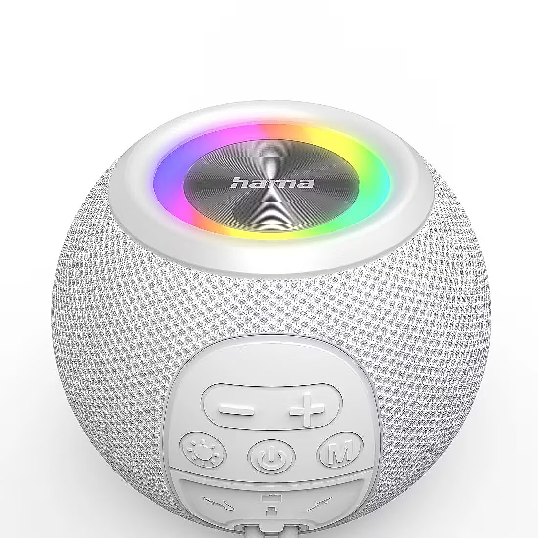 LongSummaryDescription - Hama 00188238. RMS rated power: 5 W. Connectivity technology: Wired & Wireless, Bluetooth profiles: A2DP, AVCTP, HFP, HSP, L2CAP, Bluetooth range: 10 m. Product type: Mono portable speaker, Product colour: White, Product design: Ball. Recommended usage: Universal, Compatible memory cards: MicroSD (TransFlash). Battery type: Built-in battery, Battery technology: Lithium-Ion (Li-Ion), Battery capacity: 1200 mAh