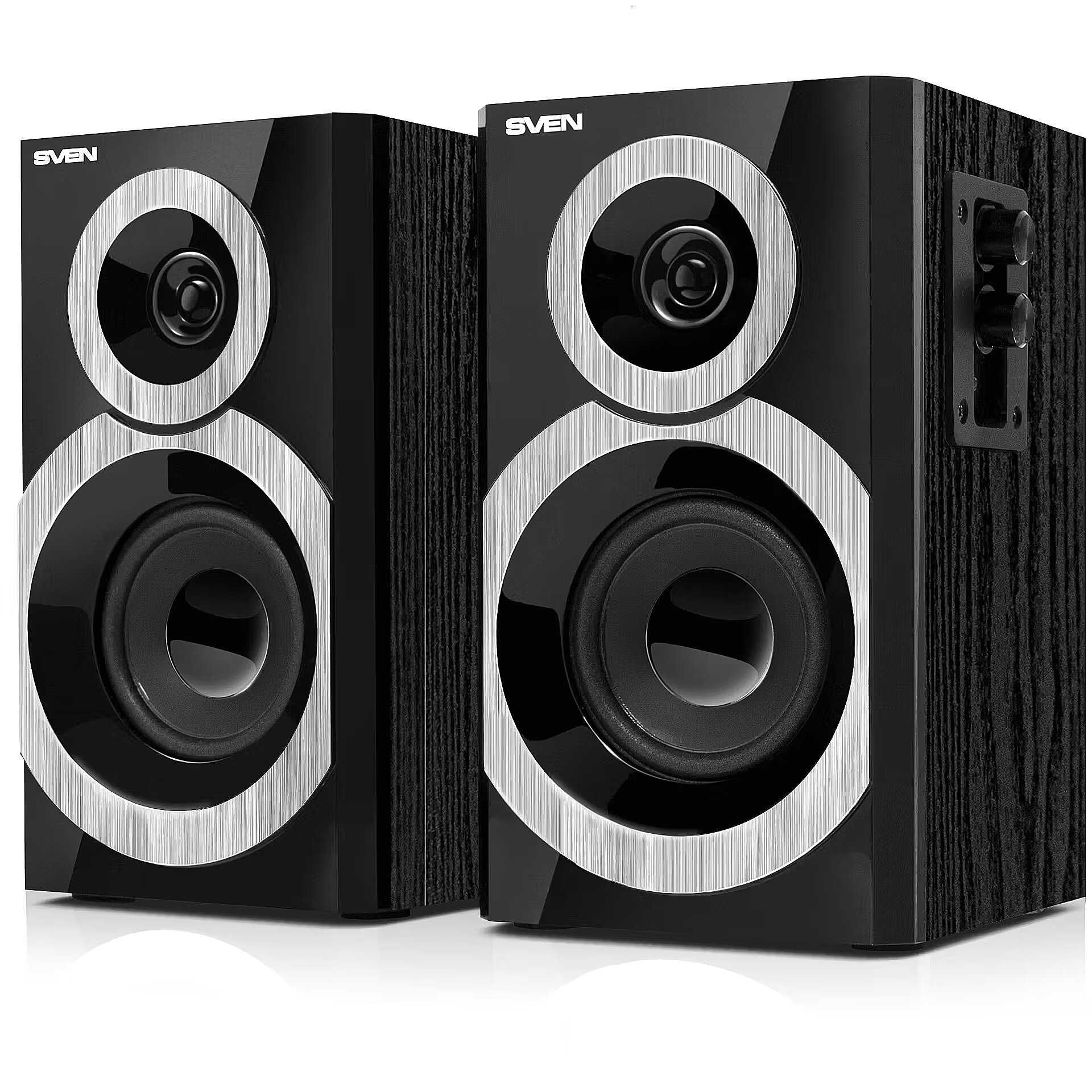 LargeDescHTML - SVEN Company presented SPS-619 speaker system in an unusual color solution – in gold, continuing by that the series of models with the unique design. Black glossy surface and light golden ornamental elements on front panels in combination with each other look very daintily and stylishly. Being casted associations with precious exhibits and masterpieces on exhibitions, the model can rightfully claim to be a “interior ornamentation” status.SVEN SPS-619 is the embodiment of the most necessaries to sound movies, computer games and listening to music tracks on PC. Its compact dimensions allow placing speakers on the worktable next to the monitor without any inconvenience for the user. A separate tweeter reproduces all tinges of the vocal, stringed instruments and percussion very distinctly, at that the tone control allows correcting the saturation of high-frequencies making the sound more explicit.It is noteworthy that cabinets of speakers are wooden (MDF). This allows suppressing different sound distortions related to physical laws of sound-wave propagation in the closed space. As the result, the sound becomes purer and more natural.The control panel is located on the side wall of an active speaker for the sake of convenience. It has the volume control of the system, as well as the treble control. Taking into consideration the computer orientation of the speaker system, there is the headphones jack on the panel conveniently.As a result, SVEN SPS-619 GOLD is an affordable functional upgrade for your PC with the design inviting to the eye and the convenient set of control options.