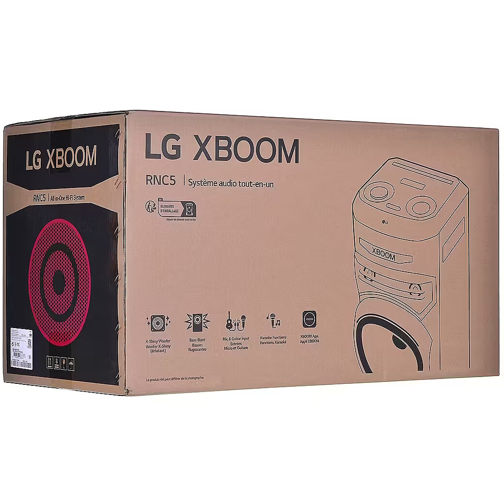 LongSummaryDescription - LG XBOOM RNC5. Audio output channels: 2.0 channels, Speaker type: 2-way, Tweeter diameter (imperial): 5.08 cm (2"). Connectivity technology: Wired & Wireless, Bluetooth profiles: AAC, SBC, USB connector type: USB Type-A. Product type: Party speaker, Product colour: Black. Recommended usage: Universal, Audio formats supported: MP3, WMA, FM band range: 87.5 - 108 MHz. Power source type: AC, AC adapter input voltage: 220-240 V, AC adapter frequency: 50/60 Hz