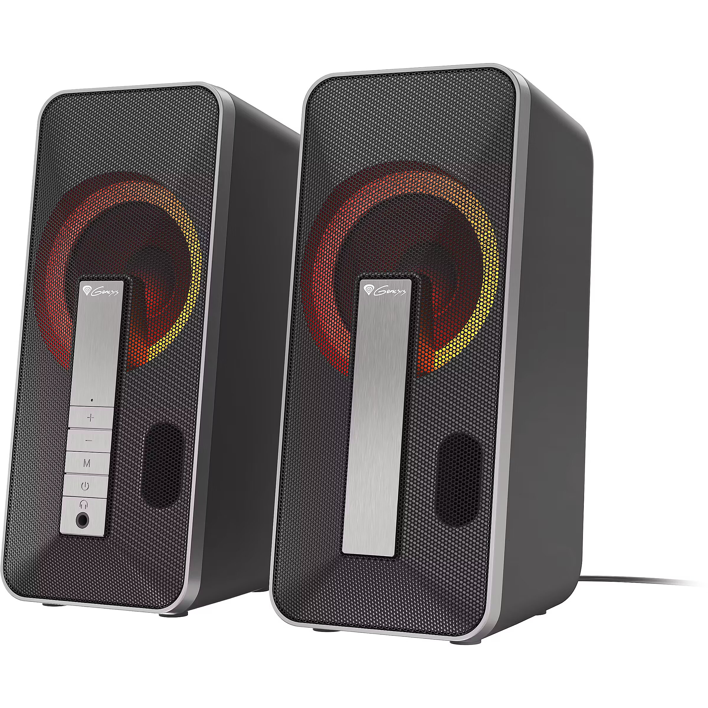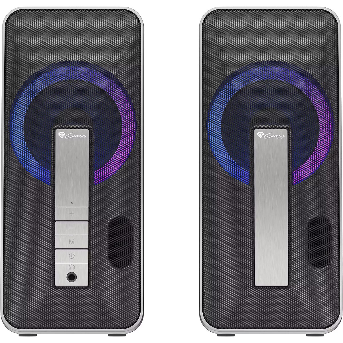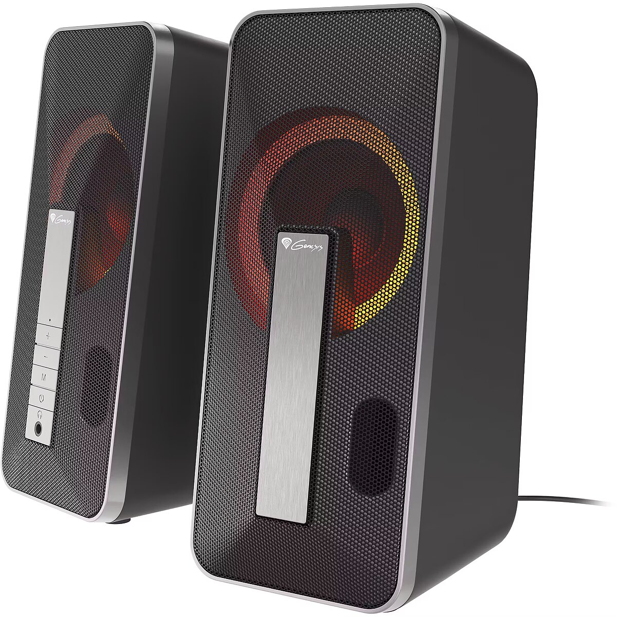 What distinguishes these speakers is a unique design combined with a mesmerizing RGB illumination effect. By combining a black matte housing with a silver brushed front panel the speakers will look great on any gaming desk.