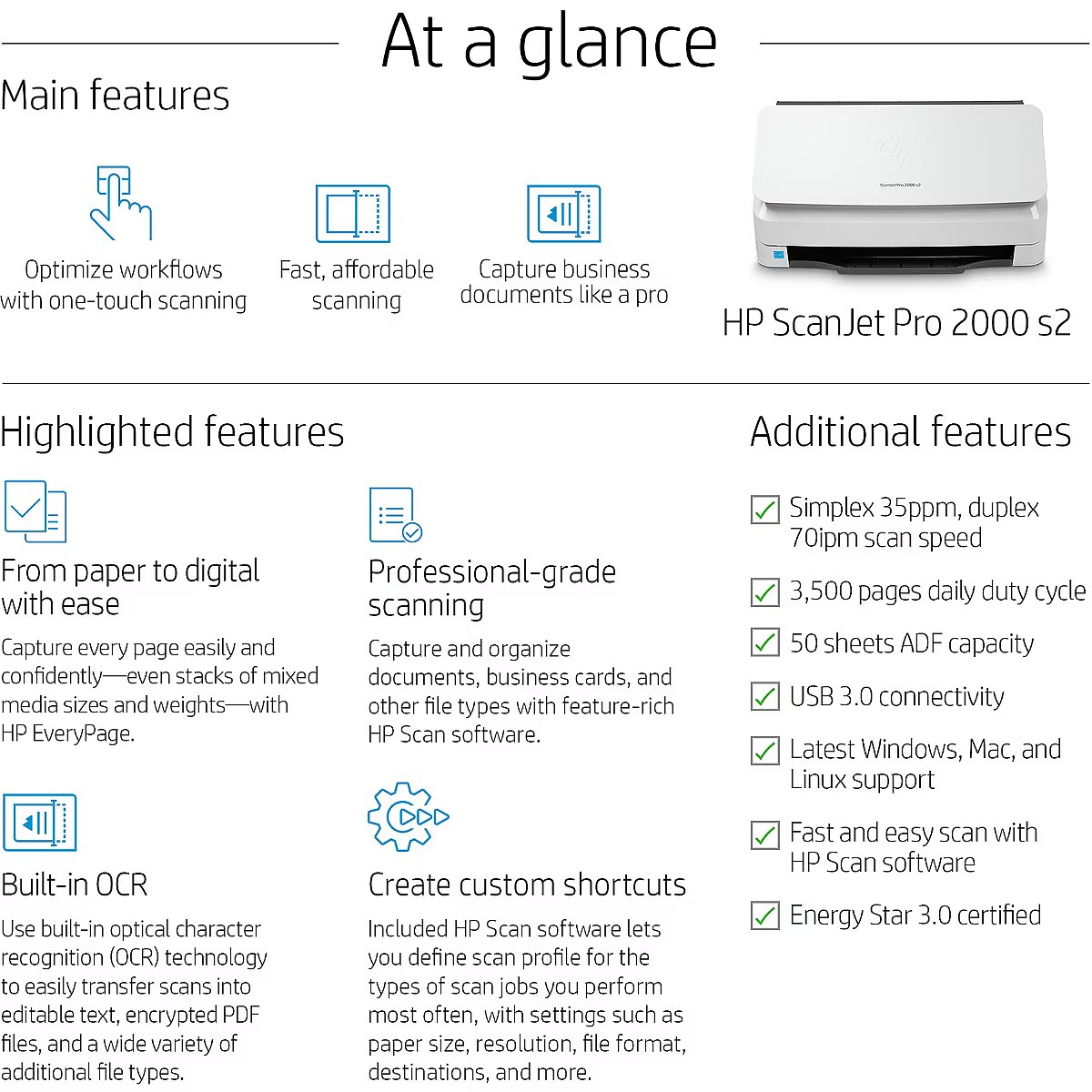 LongSummaryDescription - HP Scanjet Pro 2000 s2 Sheet-feed Scanner. Maximum scan size: 216 x 3100 mm, Optical scanning resolution: 600 x 600 DPI, Daily battery life: 3500 pages. Scanner type: Sheet-fed scanner, Product colour: Black, White. Sensor type: CMOS CIS, Daily duty cycle (max): 3000 pages, Button functions: Grayscale scan. Auto document feeder (ADF) input capacity: 50 sheets. Maximum ISO A-series paper size: A4
