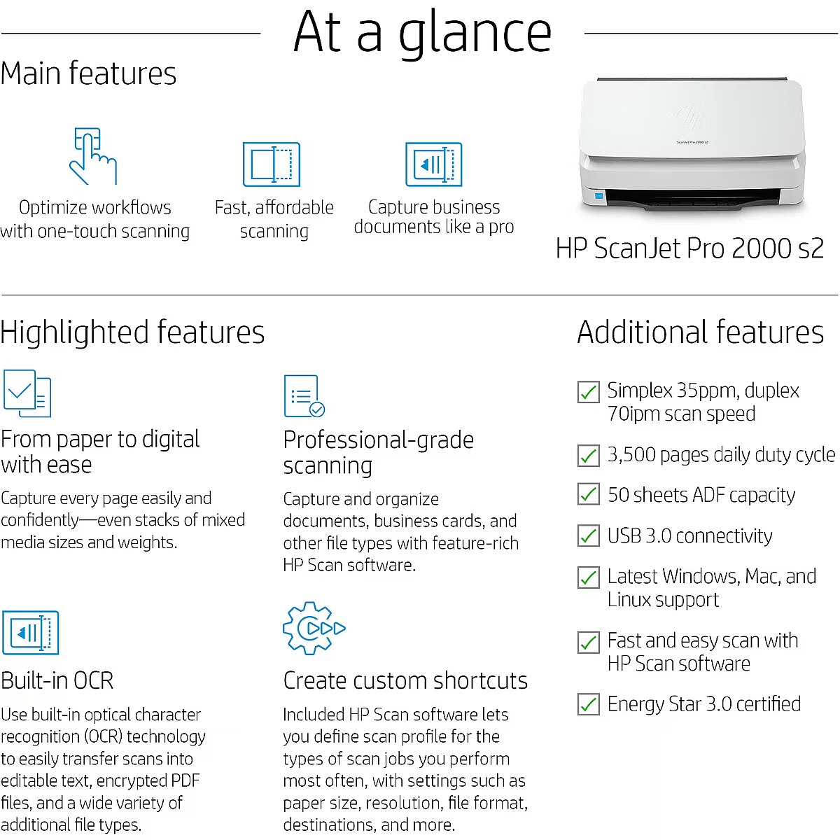 ShortSummaryDescription - HP Scanjet Pro 2000 s2 Sheet-feed Scanner, 216 x 3100 mm, 600 x 600 DPI, 3500 pages, Sheet-fed scanner, Black, White, CMOS CIS