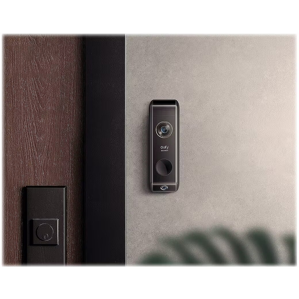 LongDesc - Video Doorbell DualSmart package detection, collection reminders and monitoring in one compact device.Two cameras.Absolute security.While the Video Doorbell Dual's front-facing camerafocuses on the postman, the additional downward-facing camera sees the package. At the same time, the second camera can even be moved to the left or right to get an almost unlimited view of the entrance area.DeliveryGuard™The exclusive Delivery Guard™ technology provides smart delivery notifications and pick-up reminders so that you can react immediately.pickup remindersVideo Doorbell Dual reminds you when packages have been forgotten so that friends or acquaintances can pick them up.packet detectionVideo Doorbell Dual notifies the family when a package arrives or when someone approaches the package. The emergency contact can even be called directly from the eufy security app for help.Accurate alerts with dual detectionMotion detection reduces false alarms by 95%.Every detail in 2K HDVideo Doorbell Dual identifies who is at the door in seconds thanks to the power of 2K HD .Smart light settingsWith high dynamic range visuals (HDR), even visitors backlit by the sun can be seen with perfect color and claritySecurity & economyThat means no one but family can access the data — and all without cloud service fees.