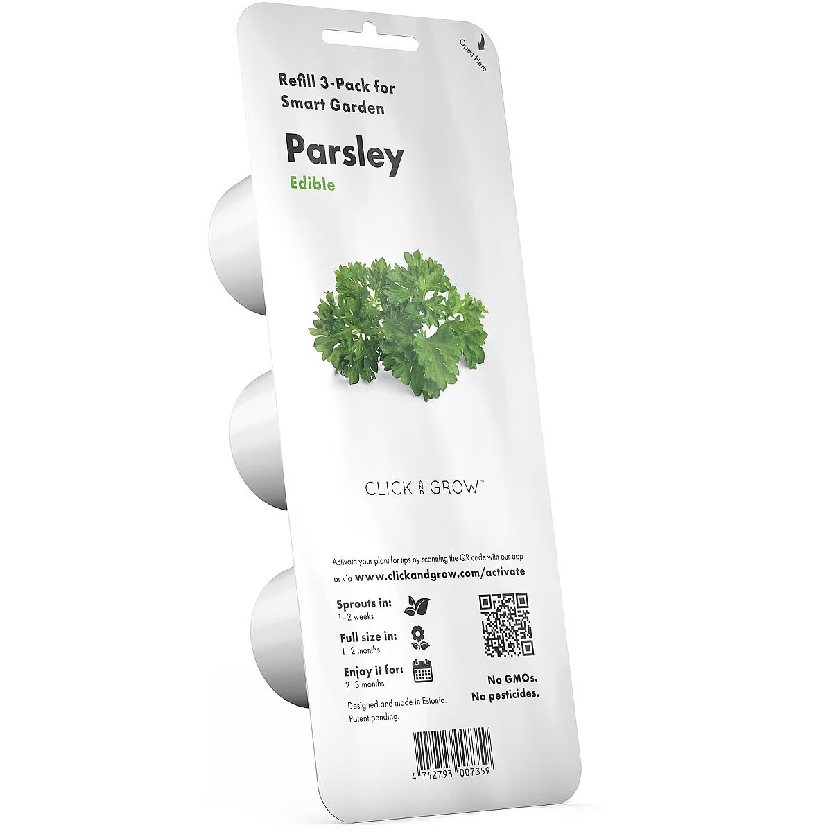 Includes 3 parsley seed plant cartridges. This plant sprouts in 7 to 14 days, grows to full-size in 1 to 2 months, and can live up to 2-3 months. Use the cartridge only with a Click & Grow Smart Herb Garden (sold separately). We're switching to a more sustainable plant capsule system, and you might receive your plant capsules without the plastic around the Smart Soil. This system works with the older Smart Herb Garden also, just don't throw away the plastic capsules!