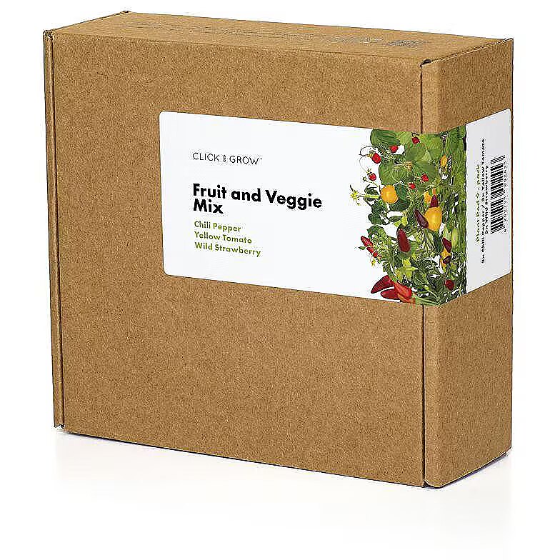 description_lv - Izaudzējiet svaigus augļus un dārzeņus savā Click & Grow iekštelpu dārzā! Vieglākais veids, kā izveidot savu augļu un dārzeņu dārzu mājās. Vienkārši pievienojiet pākstis savam gudrajam dārzam un vērojiet, kā dabas burvība nodrošina svaigu, mājās audzētu produkciju. Satur: 3 × savvaļas zemenes 3 × čili pipari 3 × dzeltenie tomāti Kā lietot: Lai augi plaukstu, katrai pākstelei atstājiet tikai vienu stādiņu čili un tomātam un divus stādiņus savvaļas zemenēm. Pirmie ziedi parādās apmēram pēc 50 dienām, un tie ir jāapputina ar rokām. Turpmākajos mēnešos nogatavosies dažādi krāsaini augļi, kas uzlabos jūsu garšas kārpiņas. Click & Grow iekštelpu dārzkopības priekšrocības: Izbaudiet tīru, veselīgu pārtiku - Click & Grow produktos nav herbicīdu, pesticīdu vai citu toksīnu Vieglāk lietojamie viedie iekštelpu dārzi, vienkārši pievienojiet augu kapsulas, un dārzs paveiks visu darbu Jūs iegūsiet dārza pieredzi savā virtuvē Mēs pārejam uz ilgtspējīgāku augu kapsulu sistēmu, un, iespējams, jūs saņemsiet augu kapsulas bez plastmasas ap viedo augsni. Šī sistēma darbojas arī ar vecāko Smart Herb Garden, tikai neizmetiet plastmasas kapsulas!