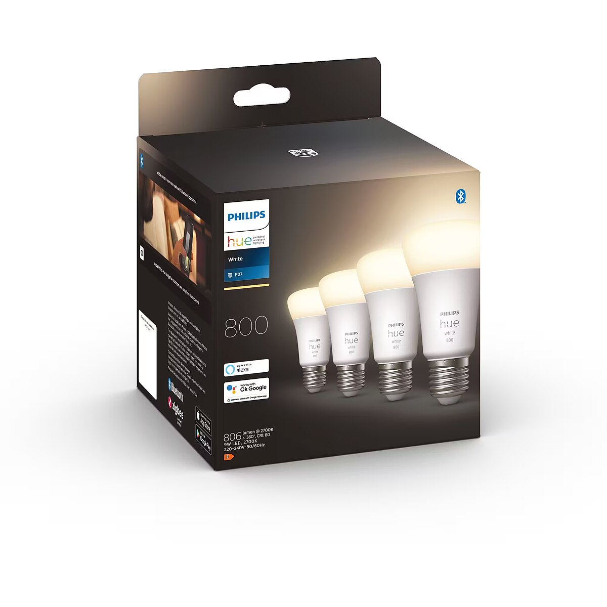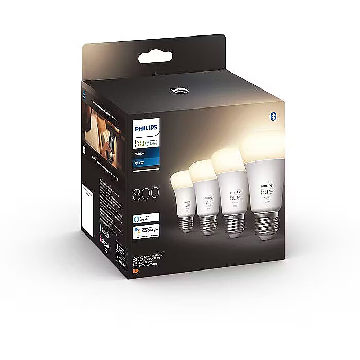 LongSummaryDescription - Philips Hue White 4-pack E27. Type: Smart bulb, Interface: Bluetooth, Product colour: White. Mobile operating systems supported: Android 10.0, Android 11.0, Android 12.0, Android 13.0, Android 7.0, Android 8.0, Android 9.0,.... Energy efficiency class: F, Energy consumption per 1000 hours: 9 kWh, Power consumption (standby): 0.41 W. Width: 61 mm, Depth: 61 mm, Height: 110 mm. Package type: Box, Package width: 146 mm, Package depth: 14 mm